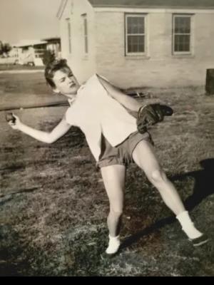 In her senior year, she was invited to the 1953 National AAU Track & Field Meet in San Antonio, TX, where she proceeded to win 1st place in the baseball throw with an amazing distance of 225’ 7” (75.5+ yards or ¾ of a football field), despite a heavily bandaged ankle. She was also recognized by her classmates her senior year being crowned Queen of Lake View High School. She also played softball in the summer since Lake View did not have a team.