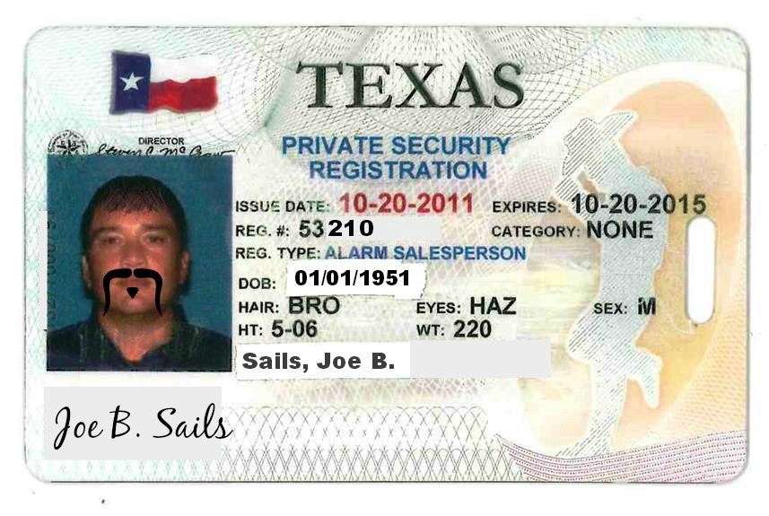 The Texas Department of Public Safety Security requires out of town companies to check in with the Texas municipality they plan to sell in. They are required to have on their person (at all times) their DPS Security License (See photo example). This license shows that they have been approved by the DPS to sell or install alarm systems in your home.