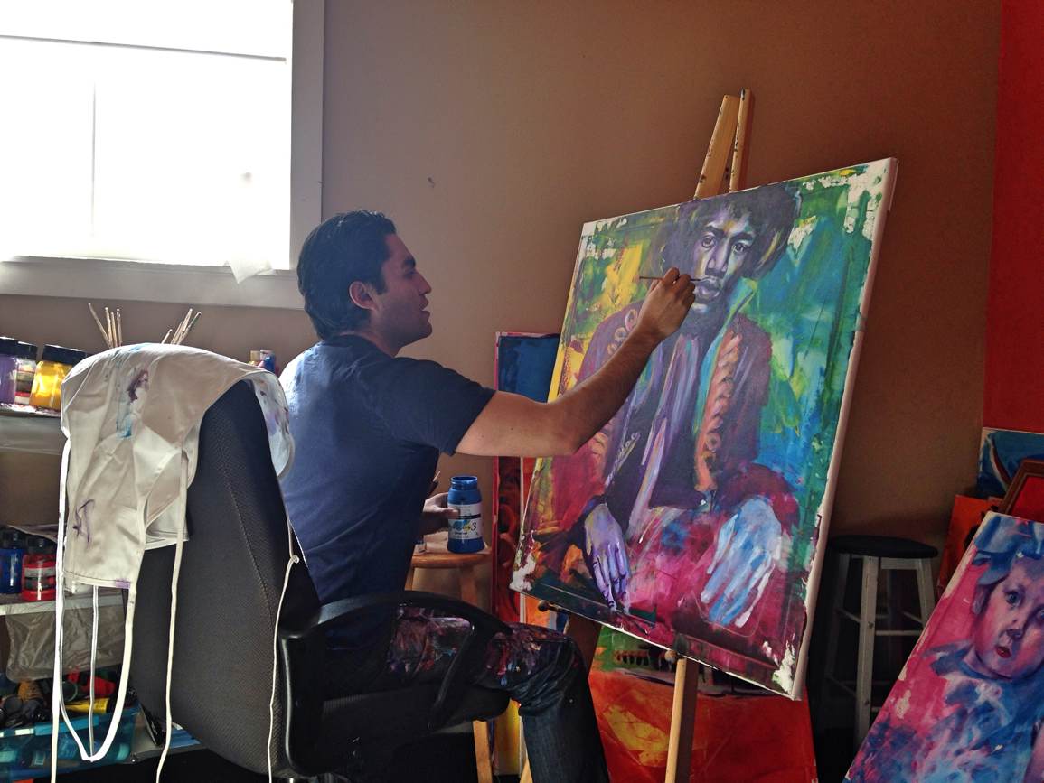 Now, the San Angelo resident spends his days busy with what for many will never become anything more than a part-time hobby. In color-streaked jeans and a simple T-shirt, he begins his work day, adding touches of bright blue highlight to an in-progress portrait of Jimi Hendrix.