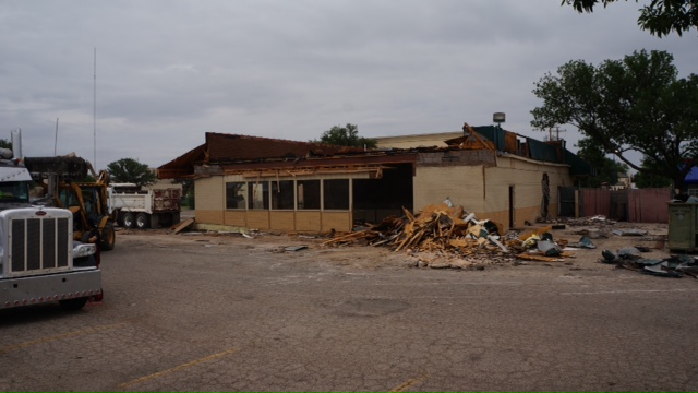 The building that housed the former Grandy's Restaurant was seen being torn down Friday as work crews prepare to build a new structure that will house a brand new Popeye's Louisiana Kitchen.