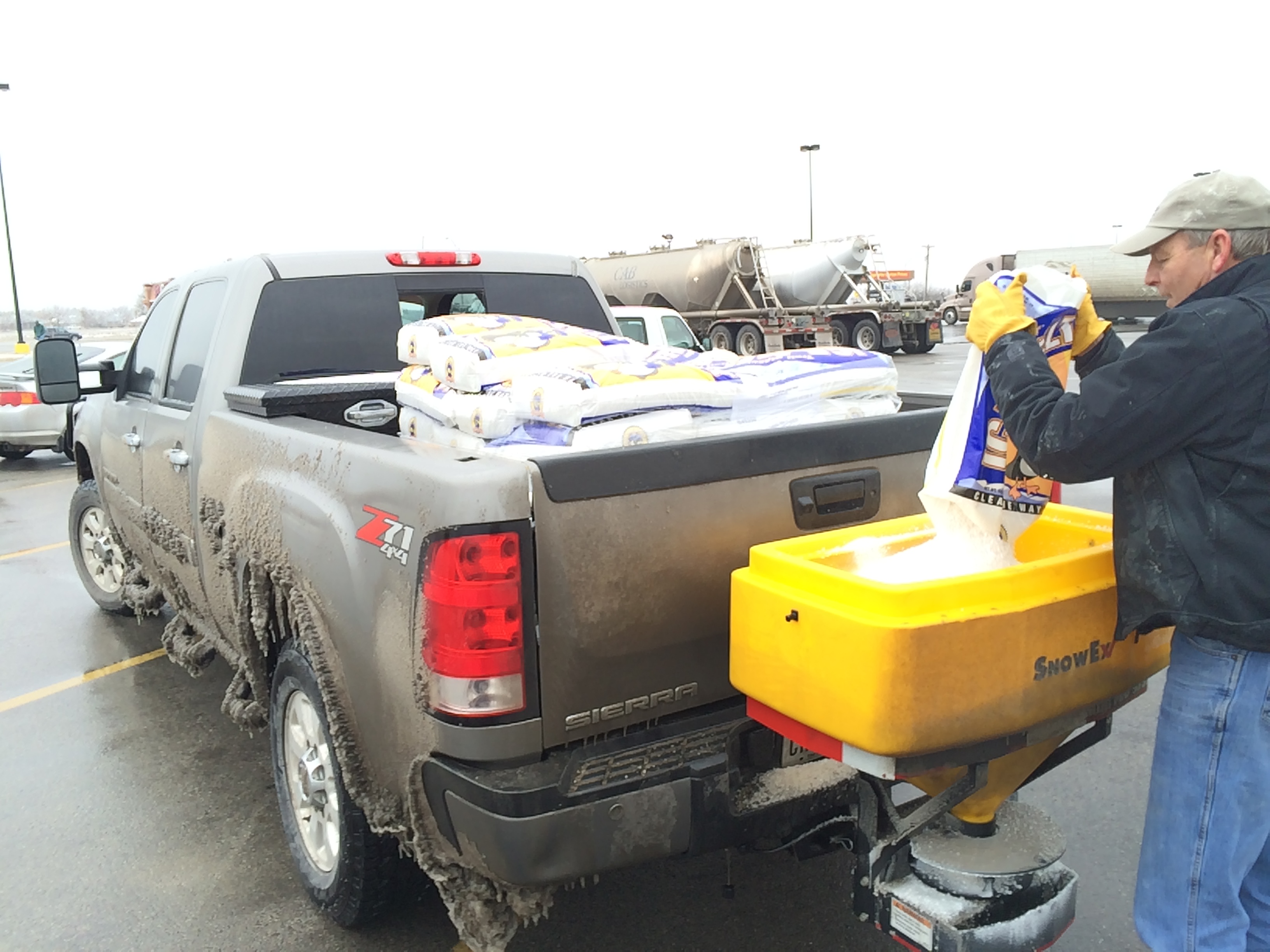 We found Steve Watts of More Clean of Texas, a company that takes care of parking lots for big box stores all over west Texas, pouring what looked like rock salt into a spreader.