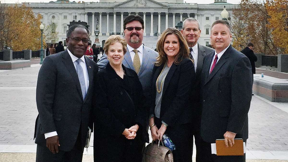 Above: A delegation organized by the San Angelo Chamber of Commerce traveled to Washington, D.C. in November update Pentagon officials and area Senate and Congressional Leaders on operations and future needs at Goodfellow Air Force Base. Pictured near the U.S. Capital is Lt. Gen. Ronnie Hawkins, USAF Retired, Dr. Carol Ann Bonds, former Superintendent of San Angelo Independent School District and Chair of the Chamber’s Military Affairs Committee, Alvin New, Chair of the Chamber Government Affairs Committee, Chamber Board of Directors Chair Jamie Akin, Tom Green County Judge Steve Floyd and Chamber President Dan Koenig. (San Angelo Chamber of Commerce)
