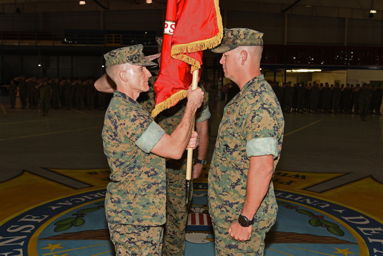 In the above photo, U.S. Marine Corps Lt. Col. Earl Patterson, Marine Corps Detachment Goodfellow incoming commanding officer, takes the guideon from Maj. Andrew Armstrong, Marine Corps Detachment Goodfellow outgoing commanding officer, during the Marine Corps Detachment Goodfellow Change of Command at the Louis F. Garland Department of Defense Fire Academy on Goodfellow Air Force Base, Texas, July 10, 2018. While holding the guideon, Patterson received verbal orders to lead the Marine Corps Detachment Goodfellow.