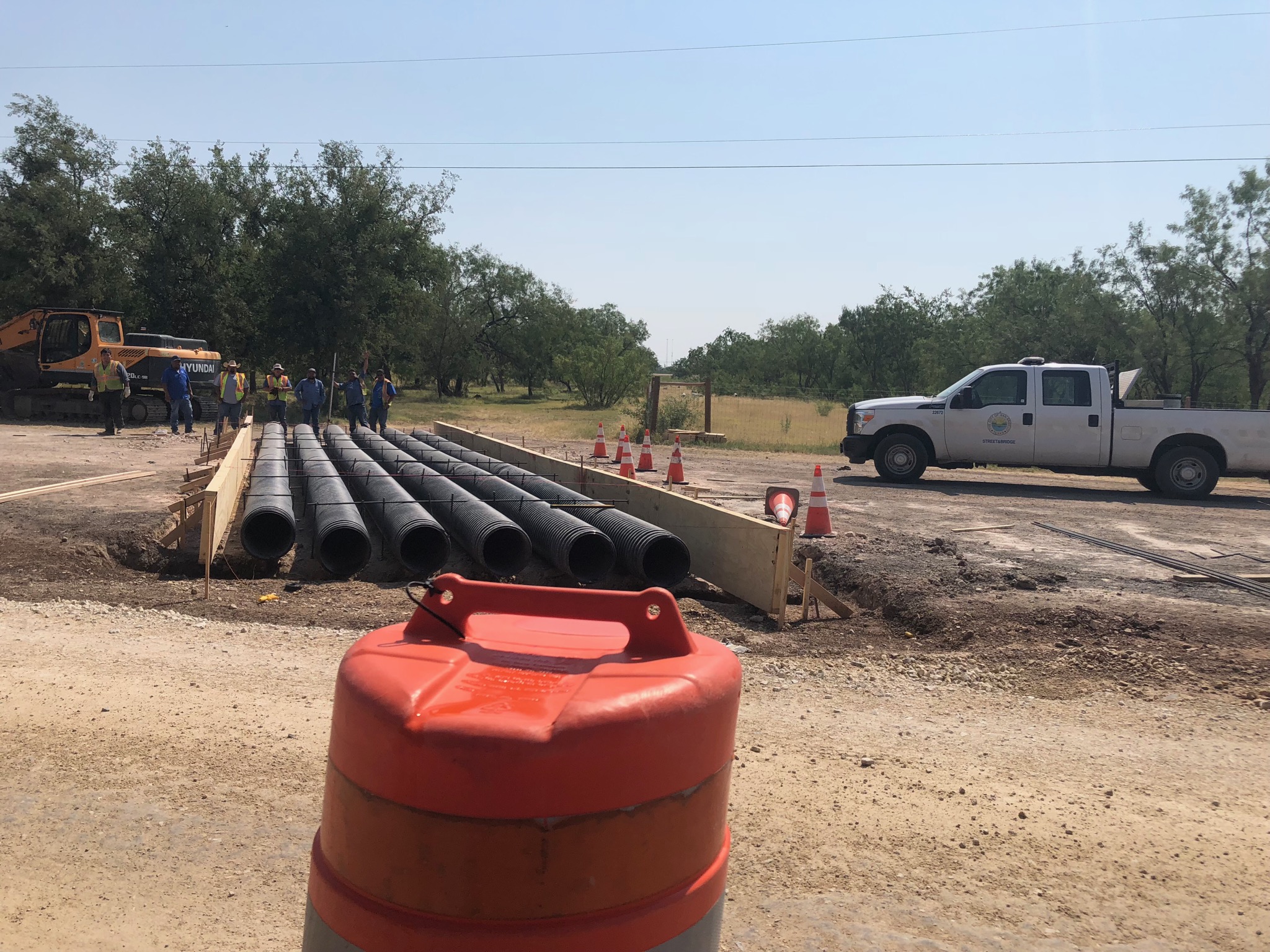 City crews have constructed a temporary road around the flood prone area while they install drainage pipes under the roadway.