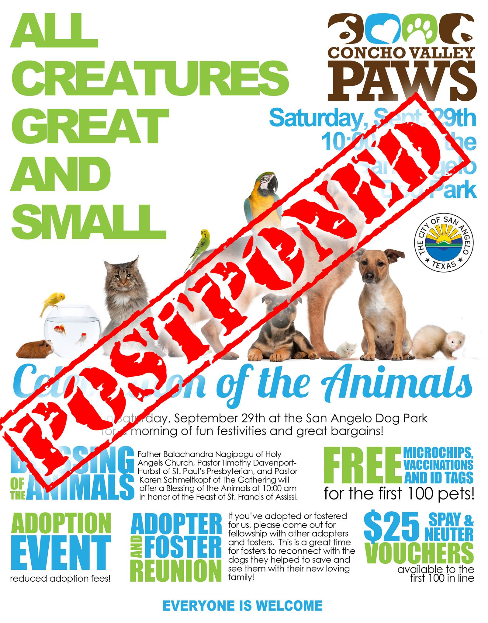 SAN ANGELO, TX -- The Blessing of the Animals set for Saturday in the Dog Park has been postponed because San Angelo has seen a significant increase of confirmed cases of Canine parvovirus.