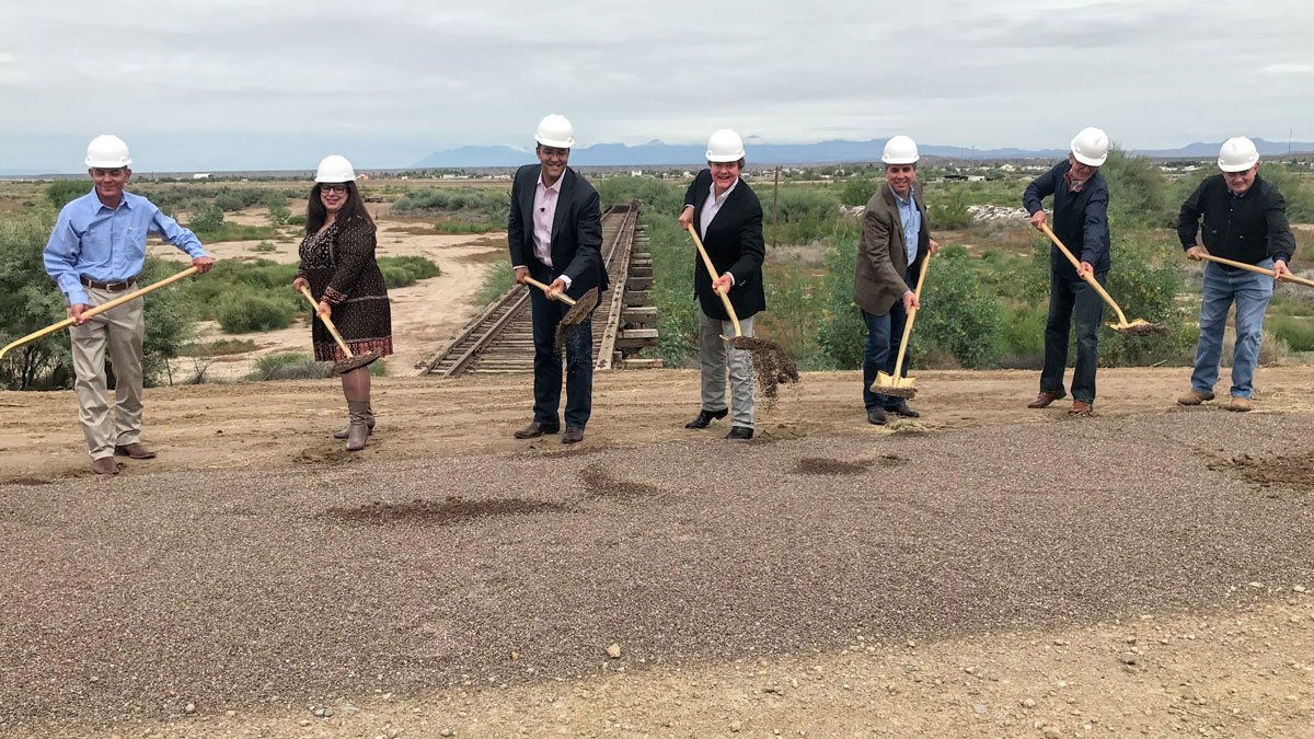 It was at the southern end of what is officially called the Presidio-Ojinaga Bridge where officials met for the groundbreaking on Monday. There, officials from TxDOT led by Williams; Chairman Bugg; Luis Saenz from Governor Greg Abbott’s office; Texas Pacifico (TXPF) Executive Vice President Federico Diaz Page; and TXPF’s marketing director Stan Meador; along with Presidio County Judge Cinderela Guevara; and Lorenzo Reyes Retana, director of corporate projects for Ferromex, dug their golden shovels into the gravel, celebrating the beginning of construction. Ferromex is the largest railroad operator in Mexico.