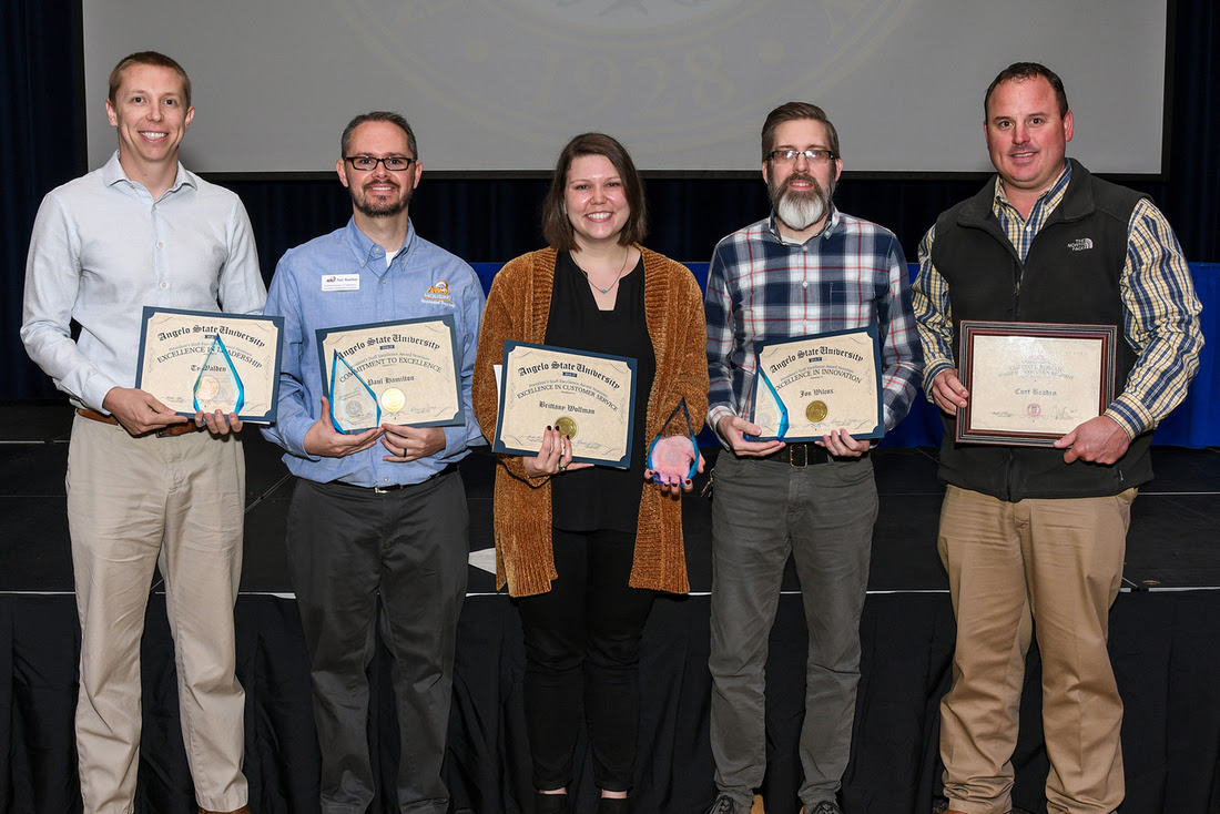 SAN ANGELO, TX -- Four Angelo State University staff members – Paul Hamilton, Ty Walden, Jon Wilcox and Brittany Wollman – have earned the 2018 President’s Awards for Staff Excellence, and another – Curt Braden – has received the annual Chancellor’s Colonel Rowan Award for Execution.