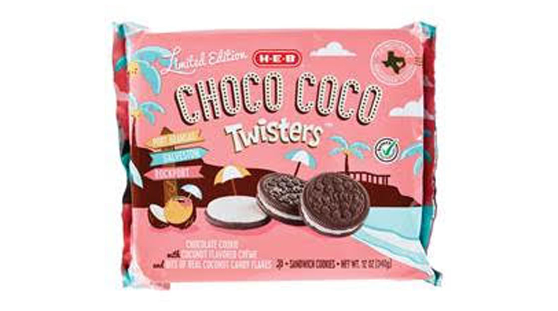 Available starting on May 6 in H-E-B stores throughout Texas, H-E-B Choco Coco Twisters have coconut crème and bits of real coconut candy flakes sandwiched between two chocolate cookies to create a delicious treat.
