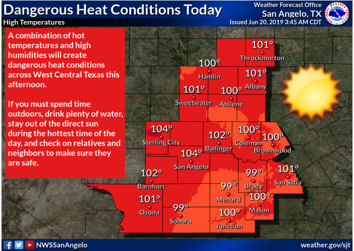 According to the NWS, a heat advisory will be in effect from 1 p.m. this afternoon to 7 p.m. this evening. Afternoon high temperatures across the Concho Valley from San Angelo to Robert Lee and Sterling City will rise into the 103 to 105 degree range this afternoon.