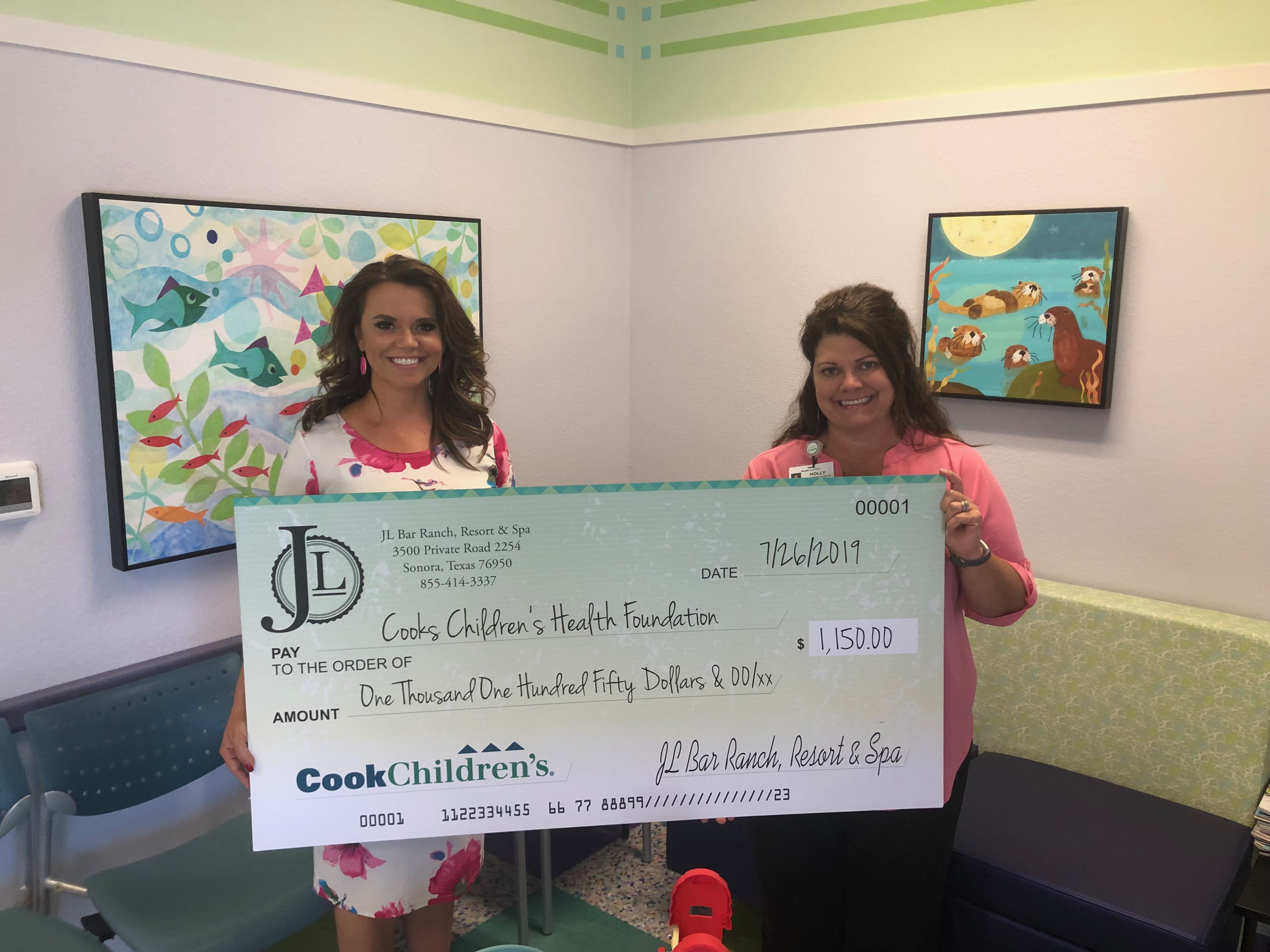 SAN ANGELO, TX -- The JL Bar Ranch Resort in Sonora held a benefit clay bird shoot in July for Cooks Children's Pediatric Specialties in San Angelo and presented a check for the proceeds Friday.