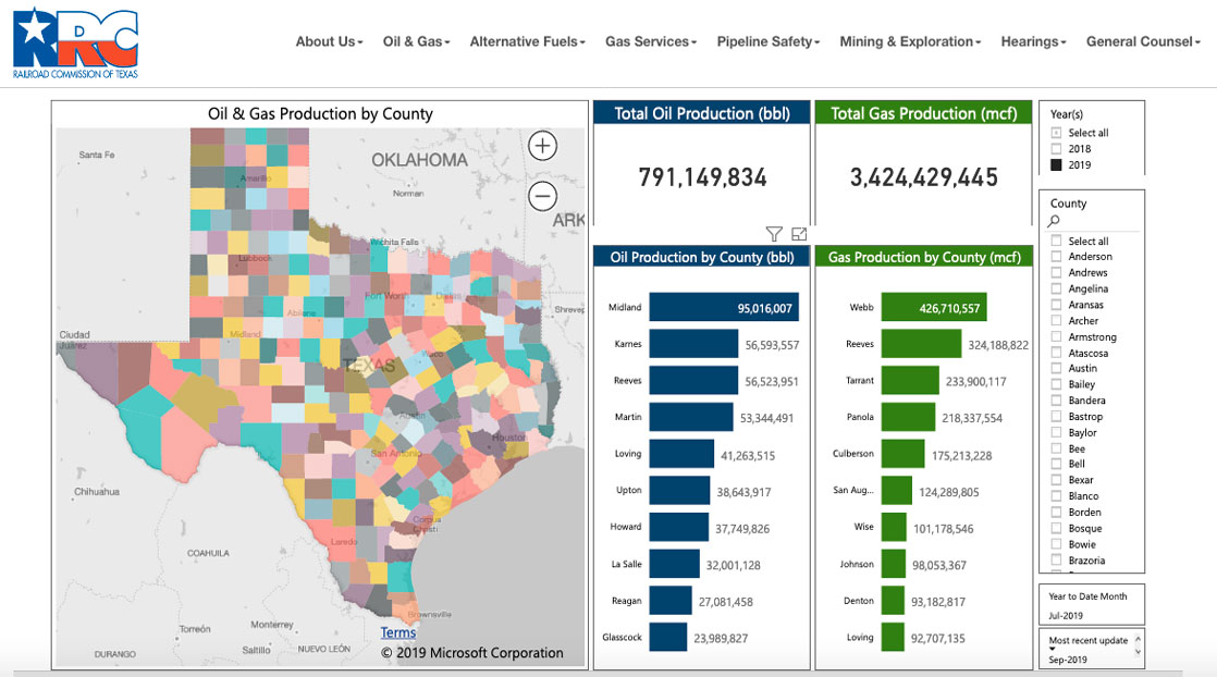 "Instead of having to create spreadsheets and conduct other extensive analysis, users can now quickly determine which county produced the most oil or natural gas in a year," said Wei Wang, RRC's Executive Director. "These are the first of several interactive data visualization tools we are planning to release in the upcoming months to better inform the public about the state's energy production and our agency's regulation."