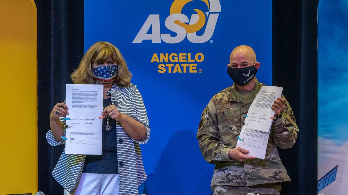 SAN ANGELO, TX — Angelo State University has entered into two new partnership agreements with Goodfellow Air Force Base: one to house GAFB students on the ASU campus, and one to facilitate faculty development opportunities for GAFB instructors at ASU.