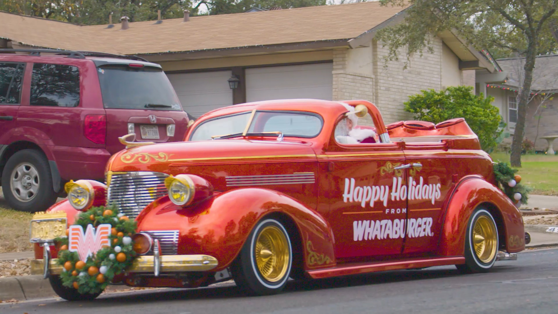 Santa even hand-delivered gifts to two lucky fans in his orange hot-rod sleigh – a 1939 Chevrolet Master Deluxe. His gift bag also included their favorite Whataburger meals and Whataburger-For-A-Year gift basket.