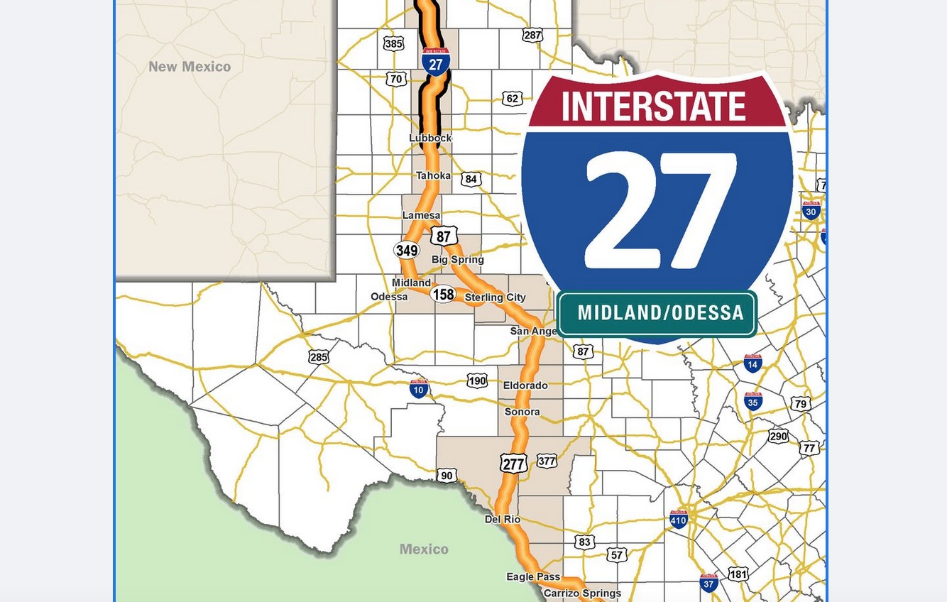 President Biden signed into law the omnibus appropriation bill that designates future I-27 from Lubbock through Midland and San Angelo to Laredo. There are two central routes including one through Midland-Odessa and one that bypasses Midland and Odessa. A portion of the Midland-Odessa route includes SH 158 from Sterling City to Midland on SH 158 and is dually designated as part of I-14 and I-27.