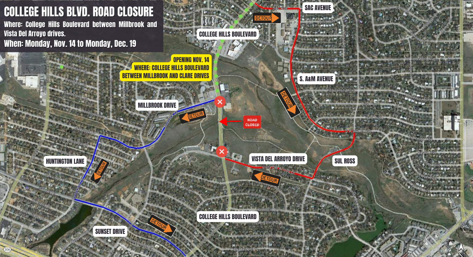 College Hill Boulevard between Millbrook and Vista Del Arroyo drives. This section will be closed to pedestrian and vehicular traffic. Please be cautious as this area is an active, unsafe work zone.