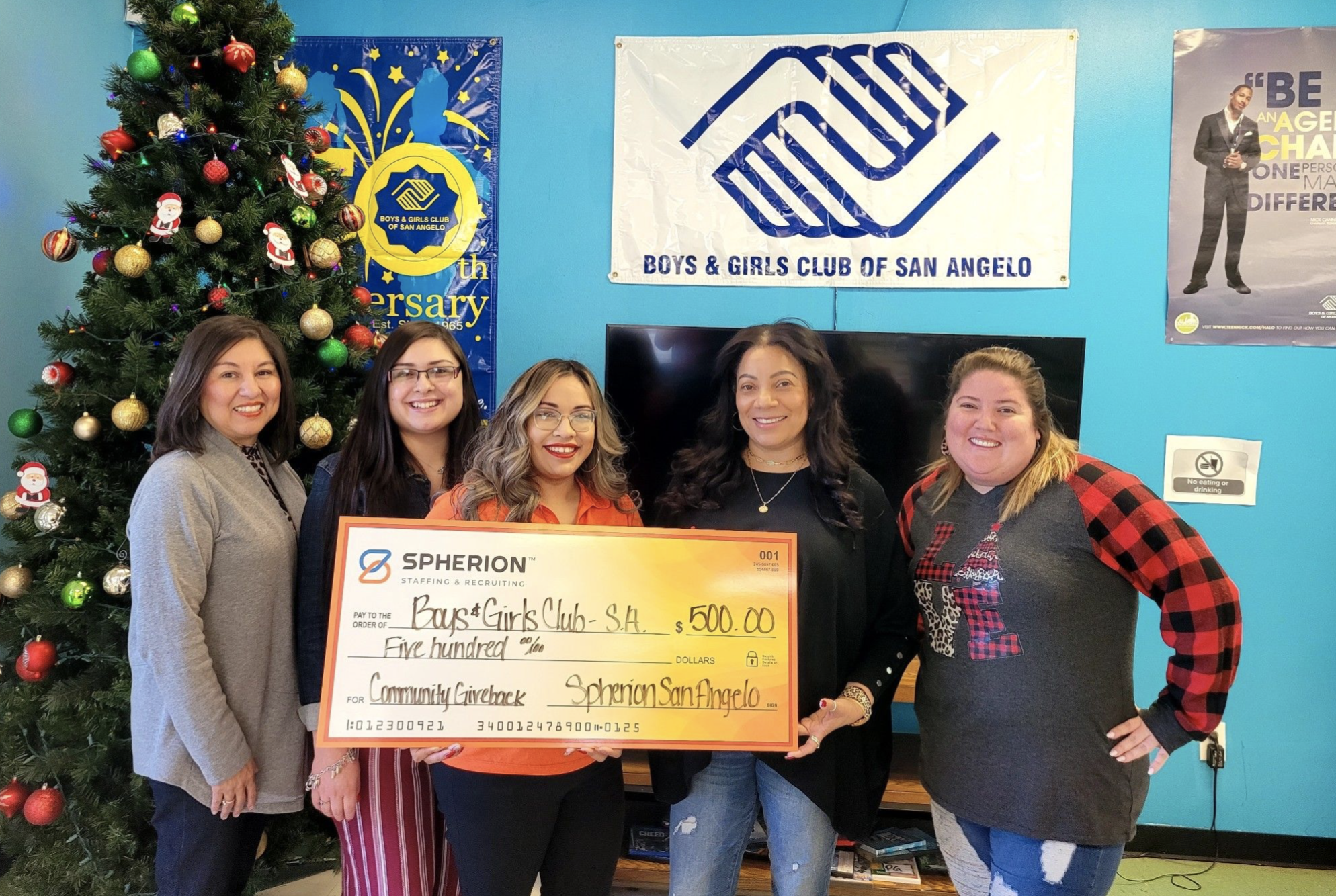 According to Spherion, on Dec. 15, Perla Garza and the team at the local San Angelo staffing and recruiting firm donated $1,000 to the Boys & Girls Club of San Angelo and $500 to Meals for the Elderly.