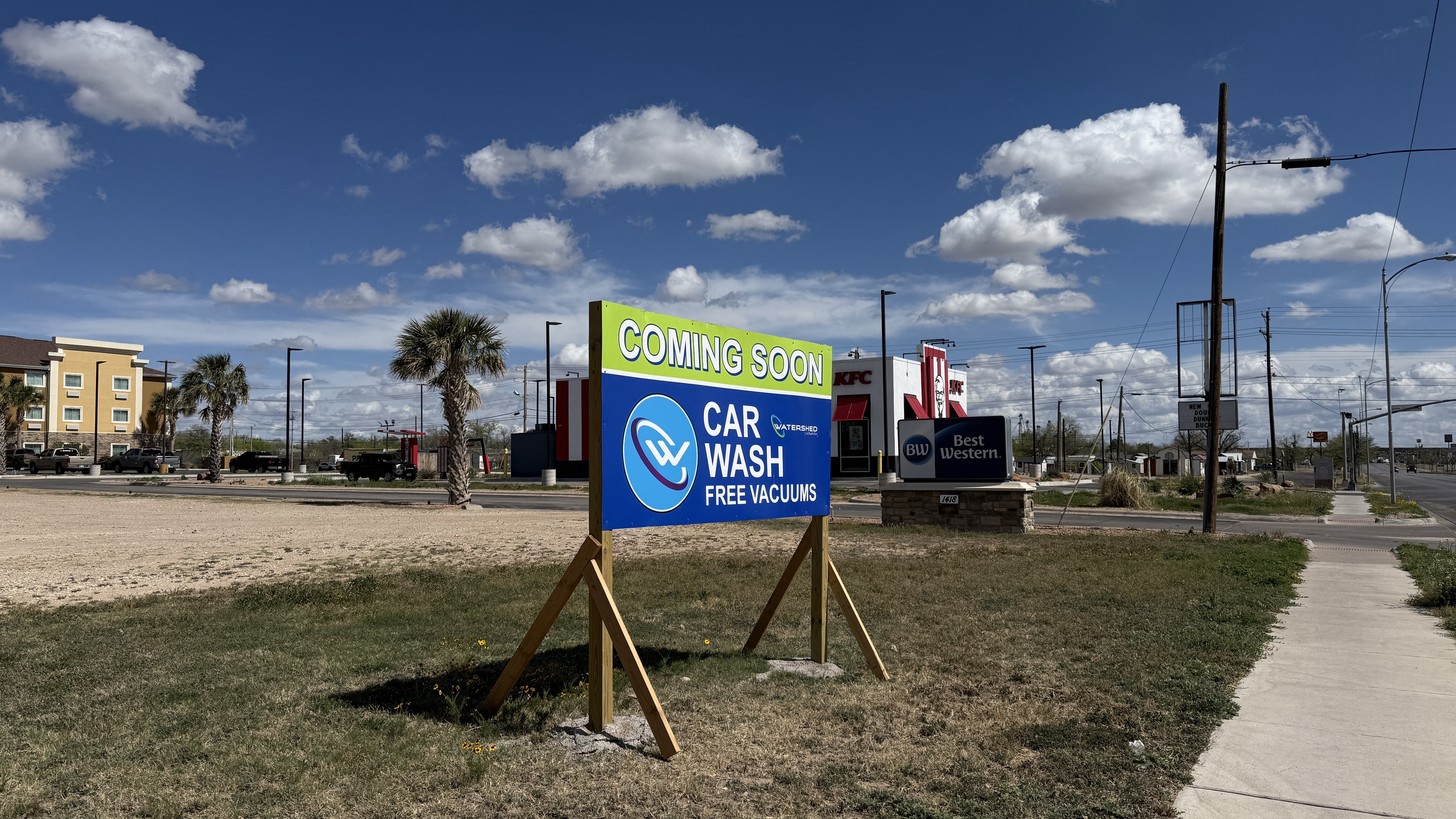 A sign posted at 1434 N. Bryant Blvd., near the Best Western hotel and KFC, announces the upcoming Watershed Car Wash location, which will feature free vacuums. City records list the project under “WCW San Angelo II Carwash,” making it one of the highest-value commercial developments currently pending.