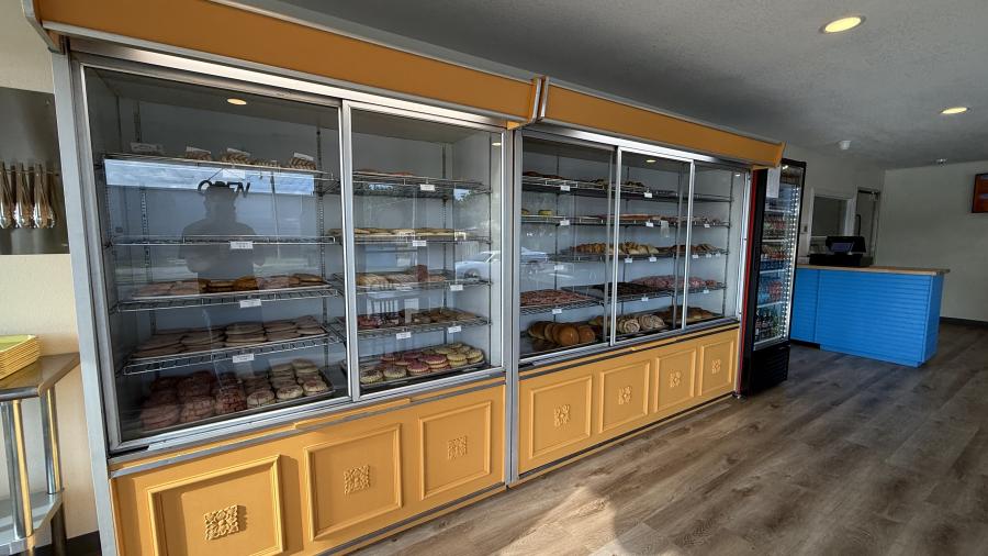 The refreshed space features fully stocked display cases with a wide variety of baked goods.