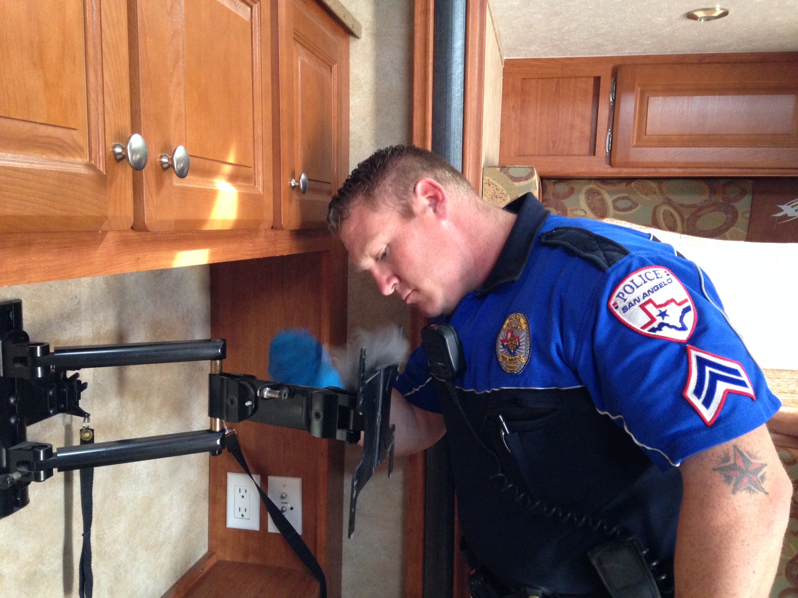 Meanwhile, Beddo dusts doorknobs and other surfaces inside the RV with a fine black powder that adheres to oily residues left by contact with human skin. When he finds what appears to be a full or partial print, he lifts the dust with a sticky tape and carefully stores it for later processing.