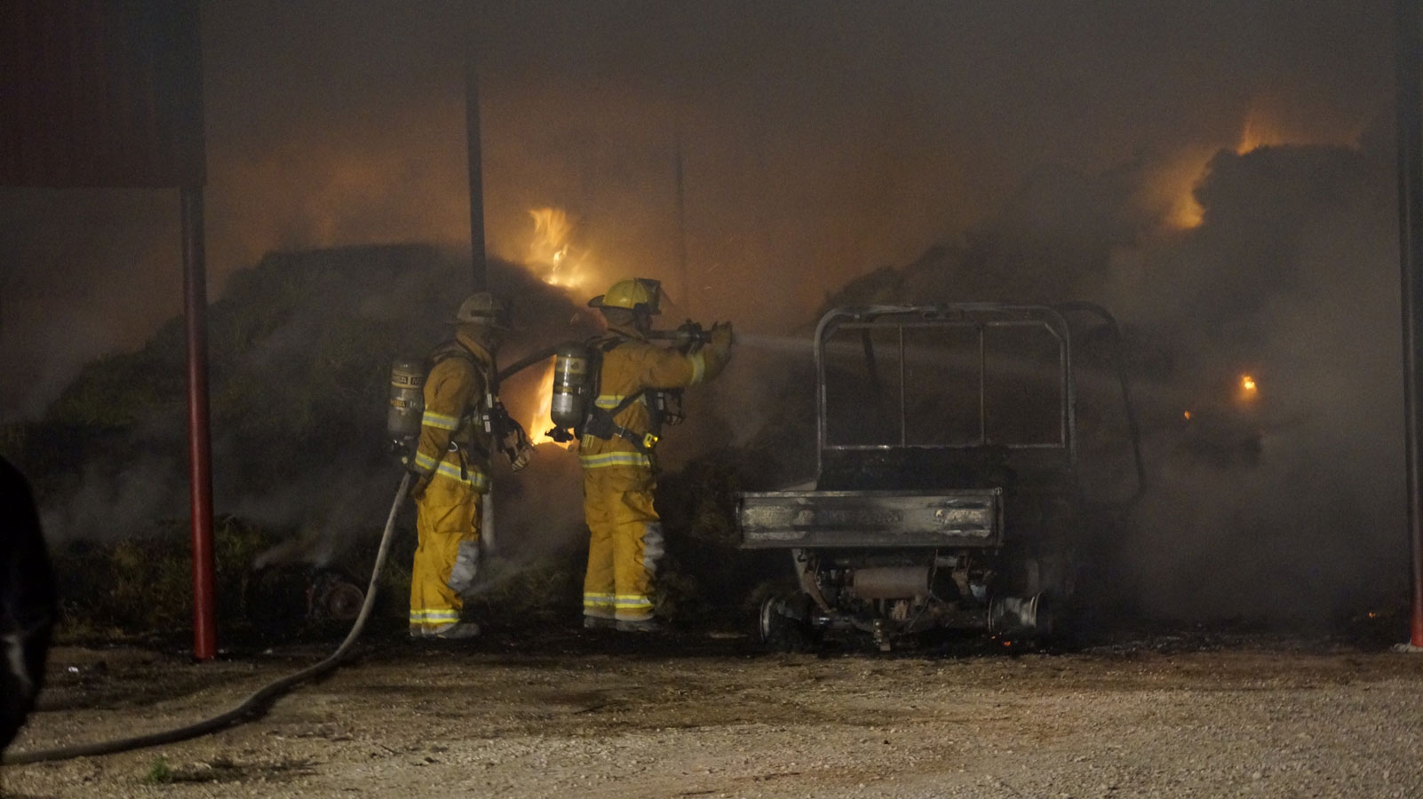 Firefighters are asking for more water. A large tractor is being used to break up bales of hay so that the embers are sure to be extinguished. Horses can be seen in the pasture. Flames can still be seen inside the barn, which appears to be built of metal.