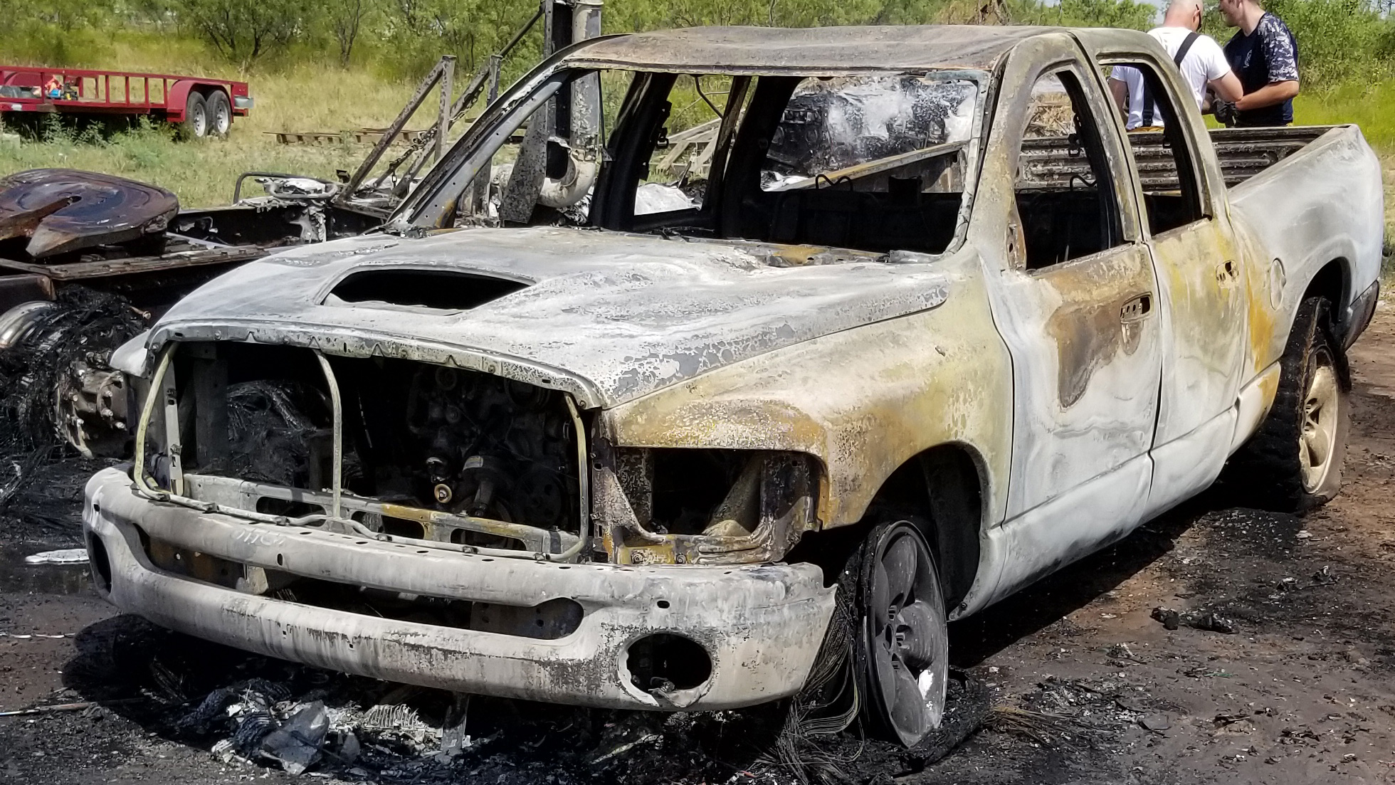 One semi truck and one pickup truck were fully engulfed in flames and both were subsequently completely destroyed. Fire department units from Grape Creek and Quail Valley kept the fire from spreading into a grass fire by protecting 2 portable buildings that were near the vehicle fires.