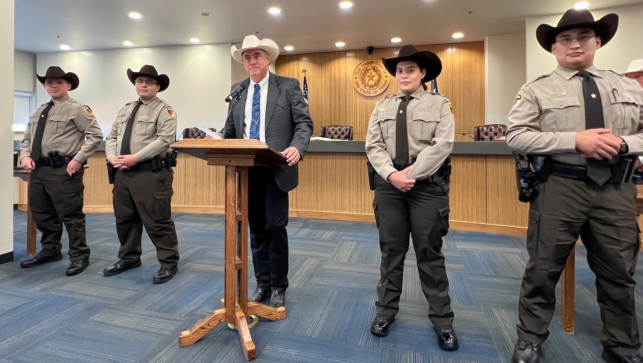 SAN ANGELO, TX — The Tom Green County Sheriff welcomed four new deputies to the force this morning in the Tom Green County Commissioners’ Courtroom inside the Keyes Building downtown. Retired Texas Ranger David Maxwell was the featured speaker, and Tom Green County Court at Law No. 2 Judge Andrew Graves officiated the swearing-in. In addition to the new deputies, Sheriff Hanna promoted three deputies.