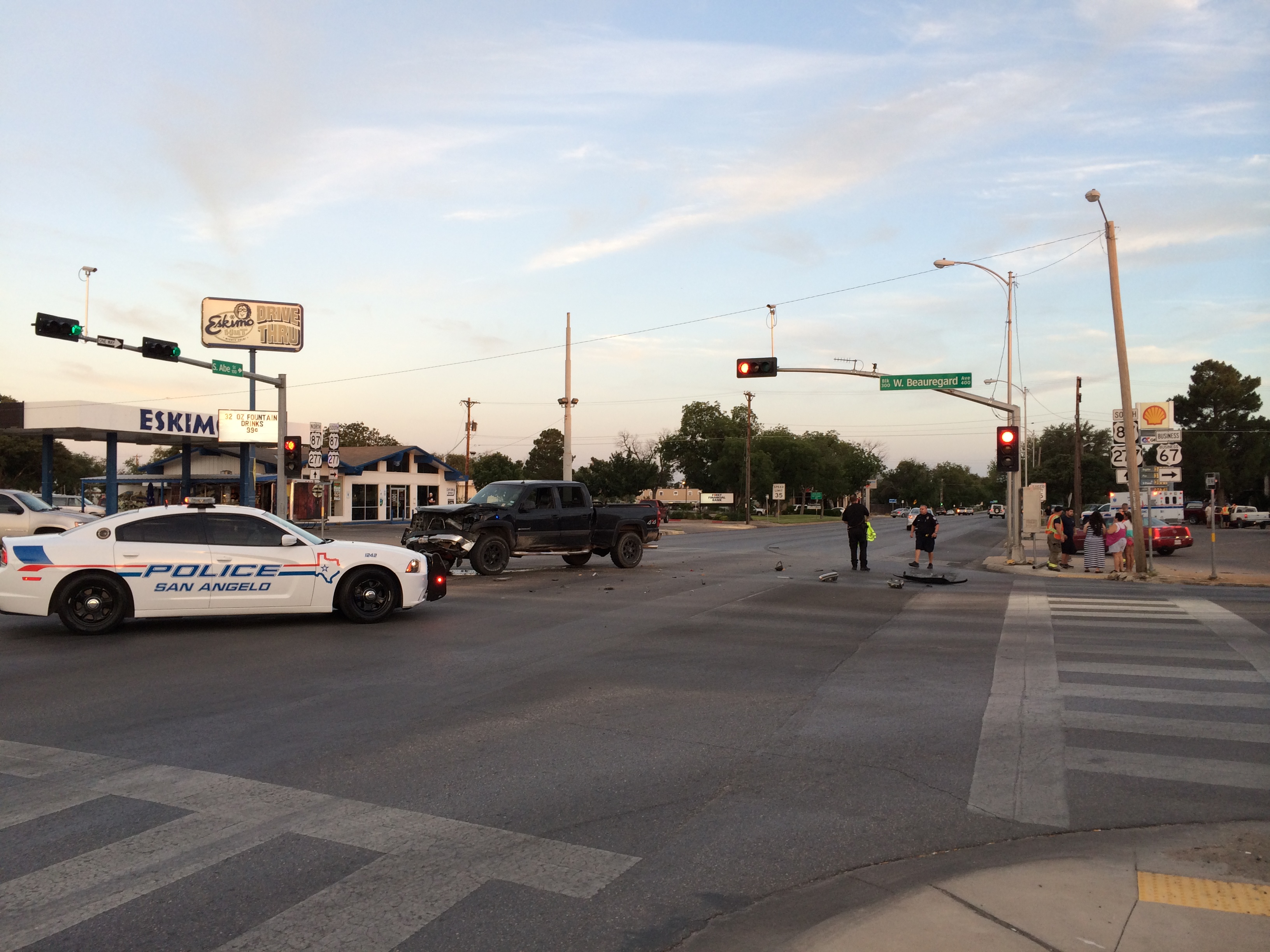 San Angelo Police Officer De La Cruz was the investigating officer. According to the investigation, the Chevy was headed south on Abe and ran a red light. The Ford Ranger was traveling westbound on Beauregard at the same time and the Chevy crashed into the Ford. The driver of the Ford was taken to the hospital with unknown injuries. The driver of the Chevy was shaken up, but in good shape otherwise. Police gave the Chevy driver a citation for running a red light. De La Cruz said that there were three witnesses.