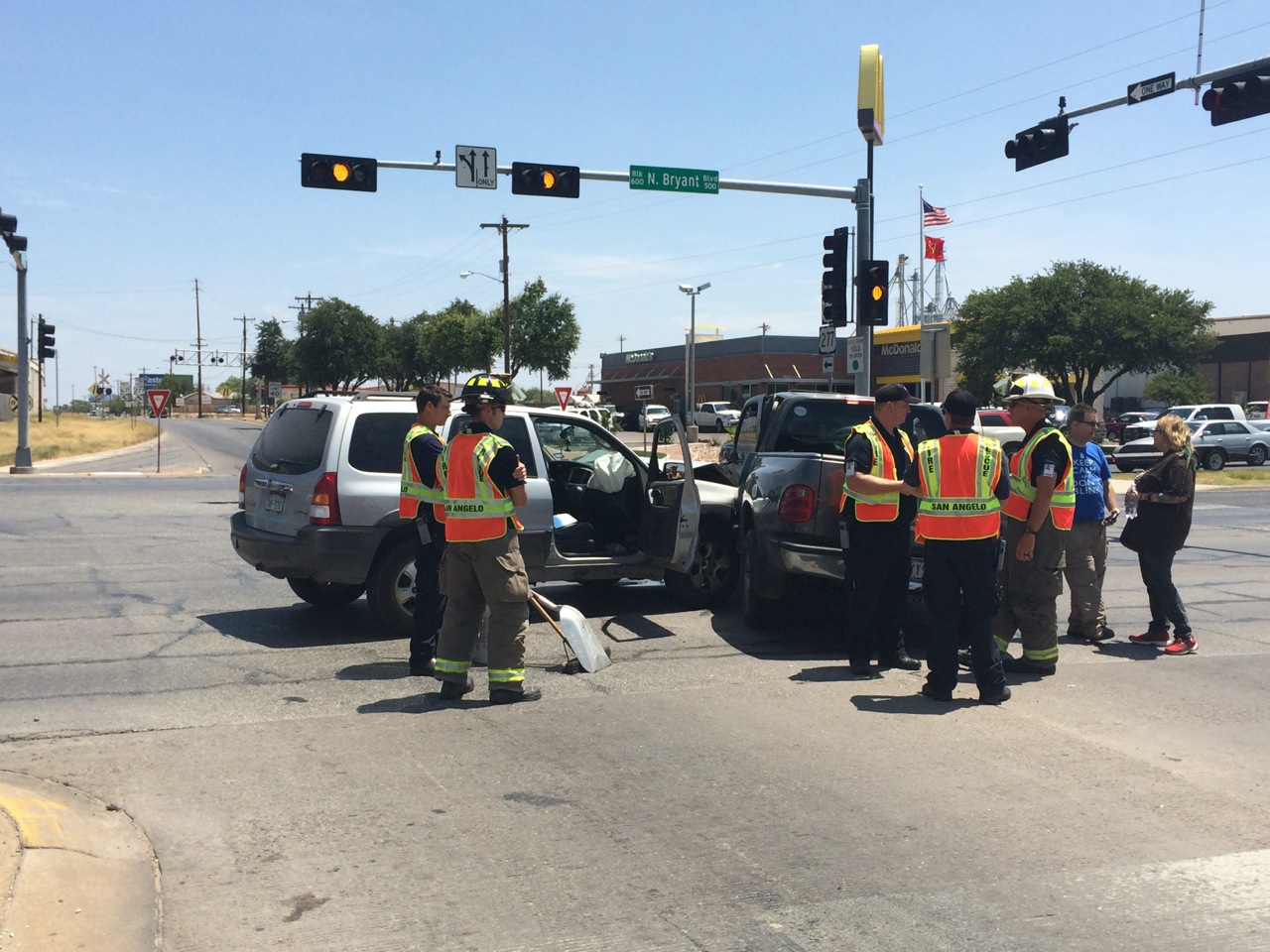 From the San Angelo Police Department: There were no injuries. The blonde lady with the lizard was in her Ford F-150 waiting to turn left on to N. Bryant northbound from 6th Street in front of Cartown Hyundai. The male driver of the Tribute, southbound on Bryant, told police that he was distracted by his baby in the backseat. He turned around momentarily to tend to the child, and when he turned back around around looked, he was running the red light and could not miss crashing into the F-150 with the blonde lady and the lizard.