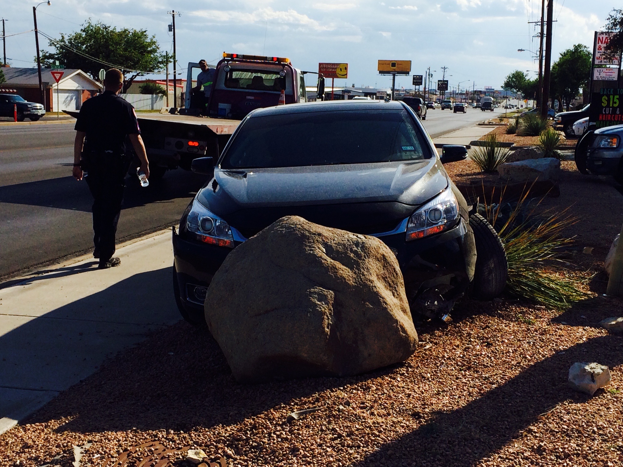 The driver was headed east on Sherwood Way when he bounced off a curb on the right side of the road. Then, the driver careened out-of-control across six lanes of traffic, ran over a cable box, a Yucca plant, a landscaping bounder, and then pushed another decorative boulder that was a part of Holiday Cleaner’s Xeriscape about five feet. The second boulder brought the car to a rest.