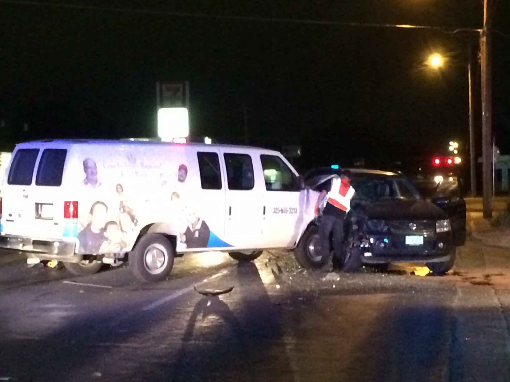 Both drivers were injured. The van driver was rushed to Shannon Medical Center complaining of neck pains. The driver of the SUV had a friend drive her to Community Medical Center with cuts and bruises.