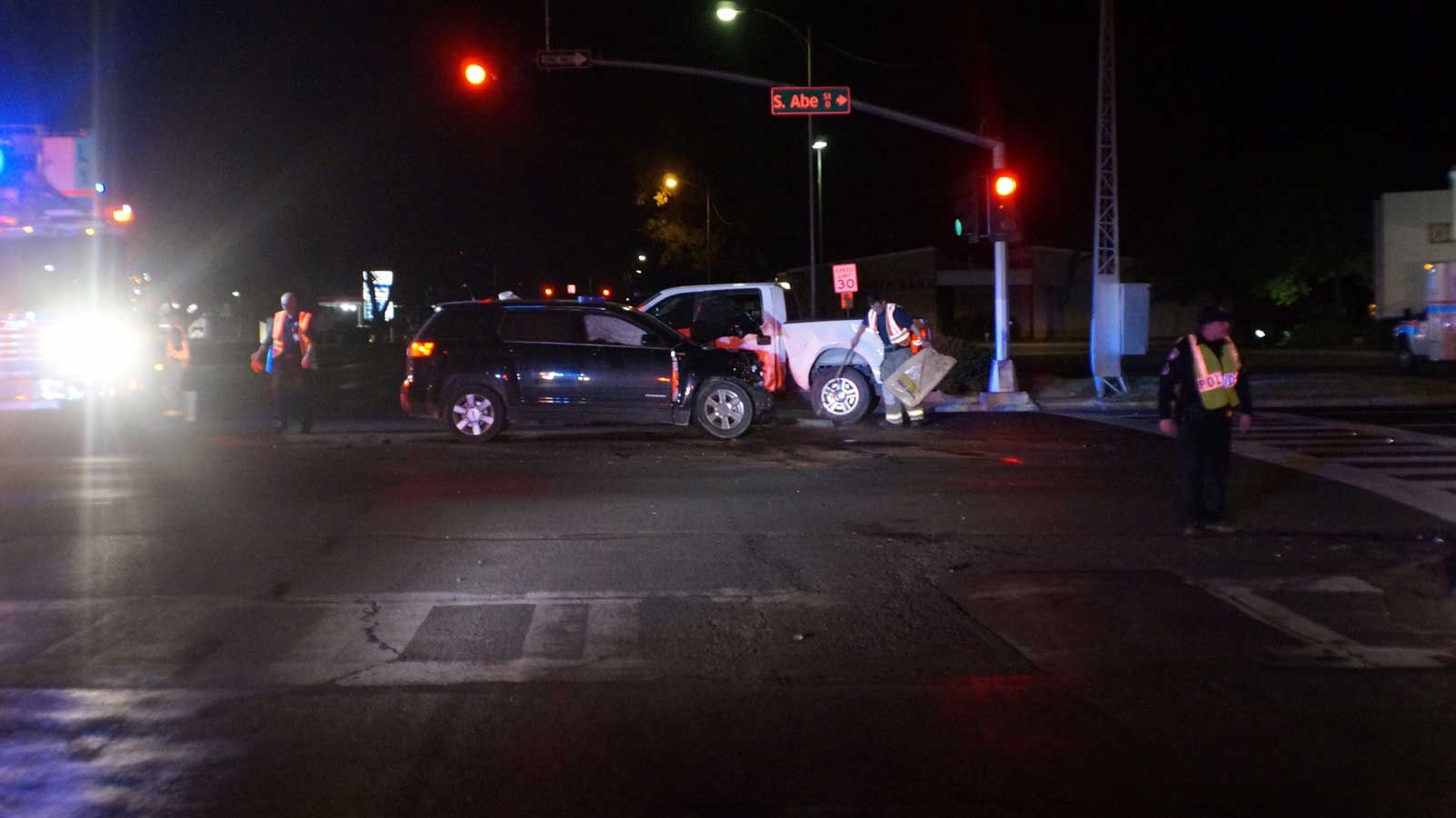 Abe Street and West Harris Avenue saw the second major vehicle crash this evening at 9:40 p.m. This time, a black Chevrolet Terrain and a white Ford F-150 collided, causing at least one to go to the hospital.
