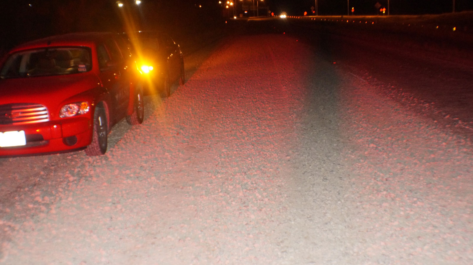 She was perhaps on the way home in her compact late model Chevrolet sedan. It gets dark early, so it is harder to see hazards on the road like a thick layer of sand and gravel. When the car hit the gravel, she tried to right the car's path. Slipping, the car rolled over.