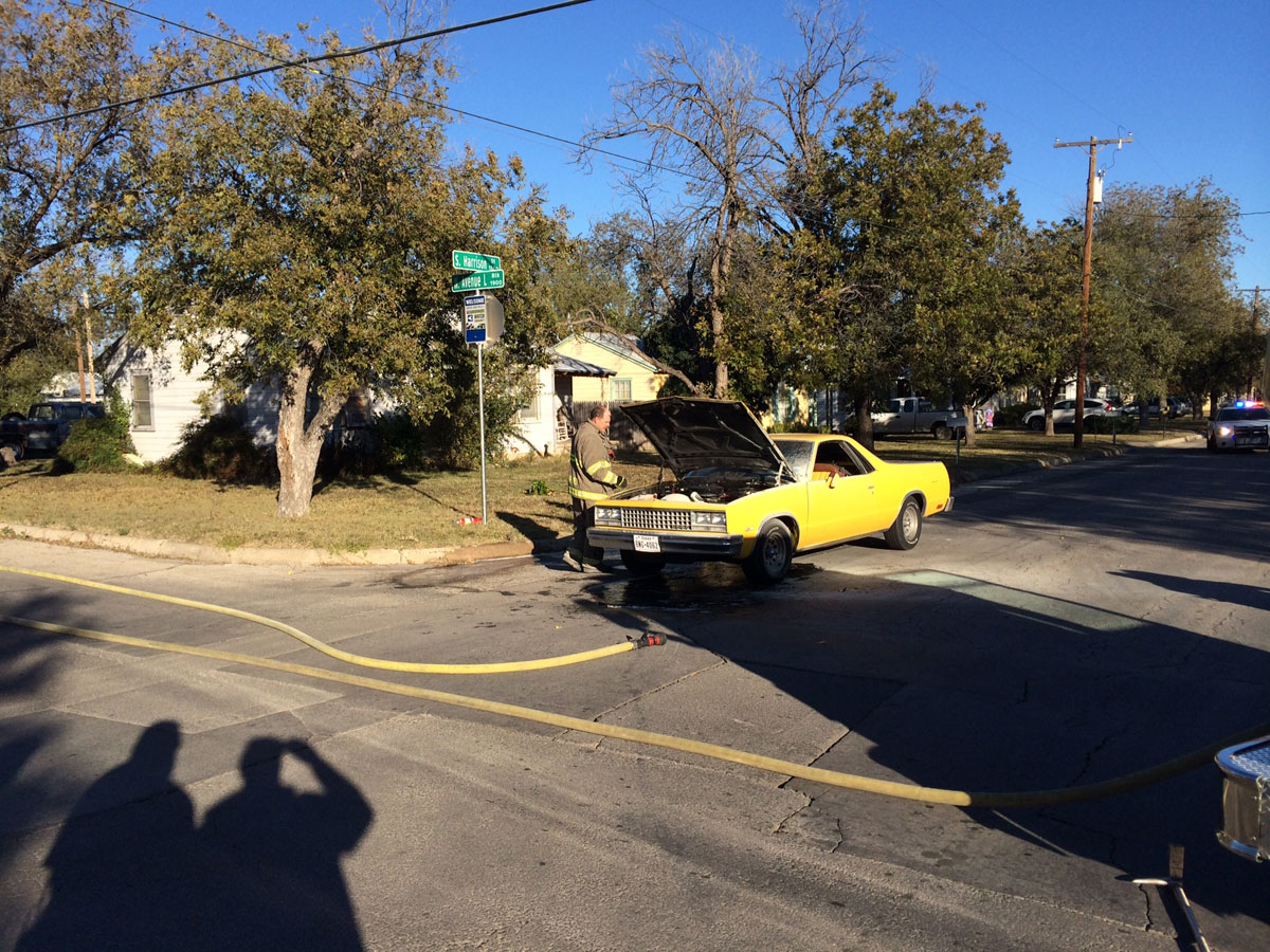 Just before 8 a.m., an off-duty, volunteer Grape Creek VFD firefighter witnessed a fire under the hood of a 1983 Chevrolet El Camino. The firefighter stopped at a stop sign at the intersection of Avenue L and South Harrison Street and the fire caught his eye. Jered Thomason, who serves Grape Creek VFD as an EMS technician said that he happened to be driving by and saw it.