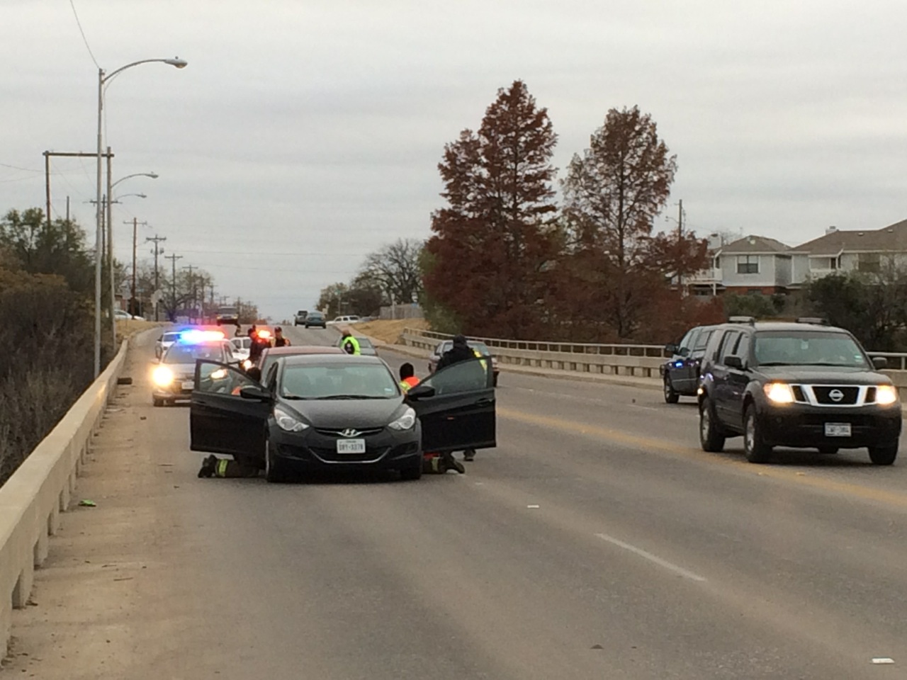 Three Hyundai Elantras were travelling north on Bell Street, according to San Angelo police. The Black Elantra in the front came to a stop due to debris in the middle of the road on the bridge. The second, maroon Elantra was able to stop behind the black car. But the gray Elantra, the third in line travelling the same way, did not see the two cars stopped on the bridge and ran into the maroon Elantra. The impact pushed the maroon Elantra into the black one.