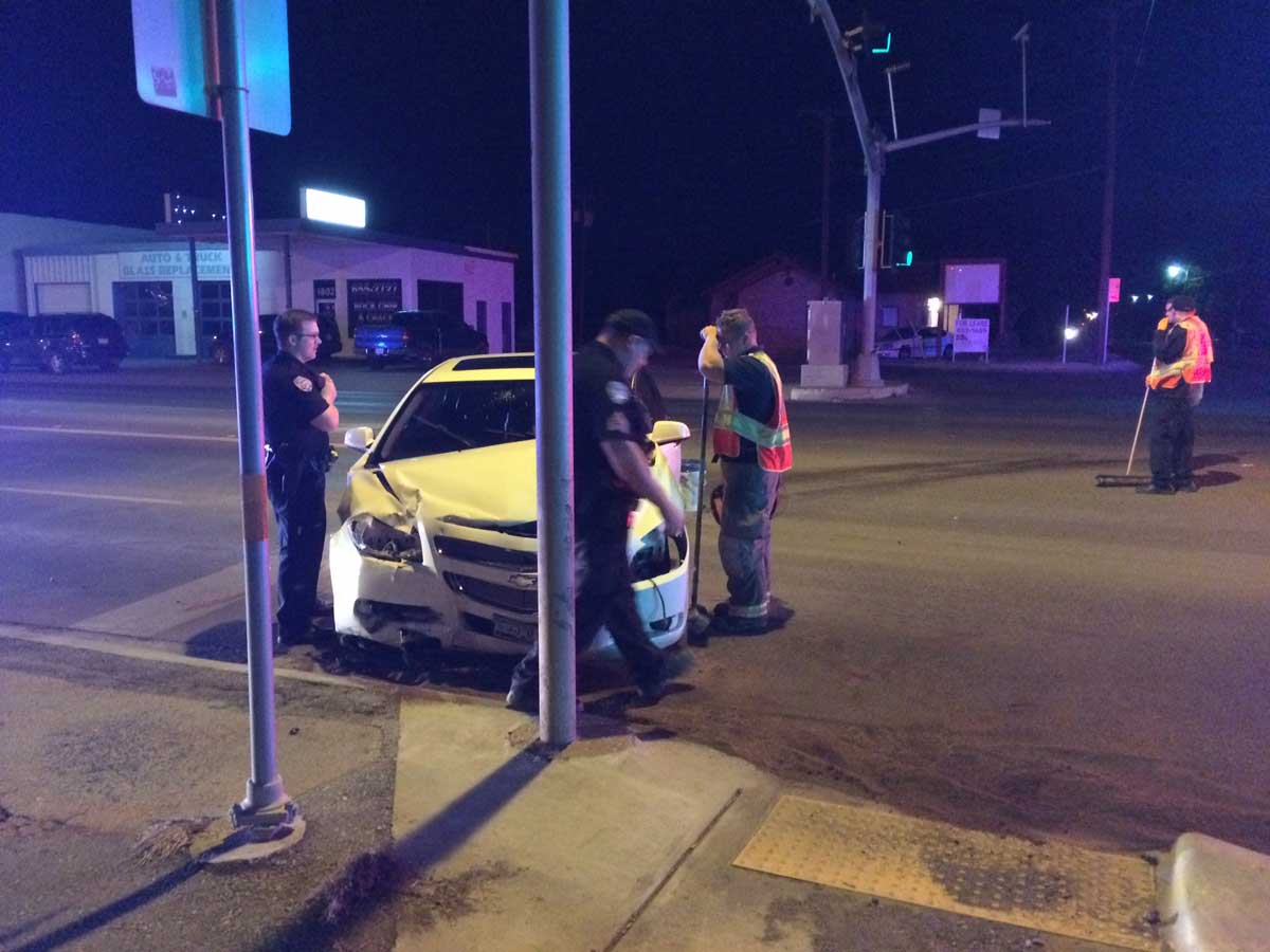 A white, late-model Chevrolet Malibu was westbound on W. Beauregard Avenue. There is a traffic light at the Van Buren intersection. The Malibu driver didn’t see it.