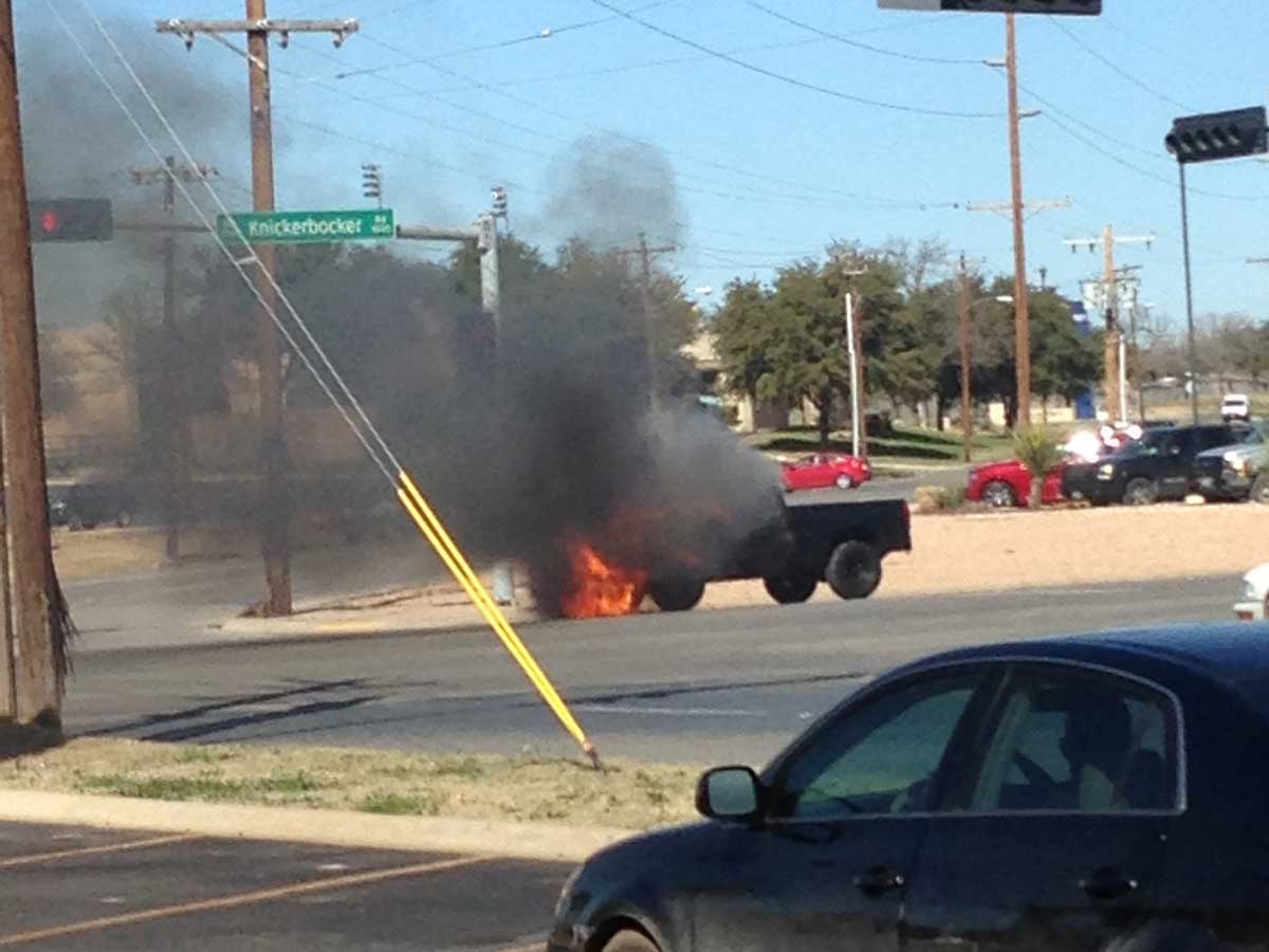 A 1995 Chevrolet pickup caught fire while traveling down Knickerbocker Road Sunday afternoon. According to fire investigator Karla Steppe of the San Angelo Fire Department, the driver of the truck said that he heard a loud pop or bang. Immediately after the noise, the driver observed white smoke filtering up from underneath the hood of the engine.