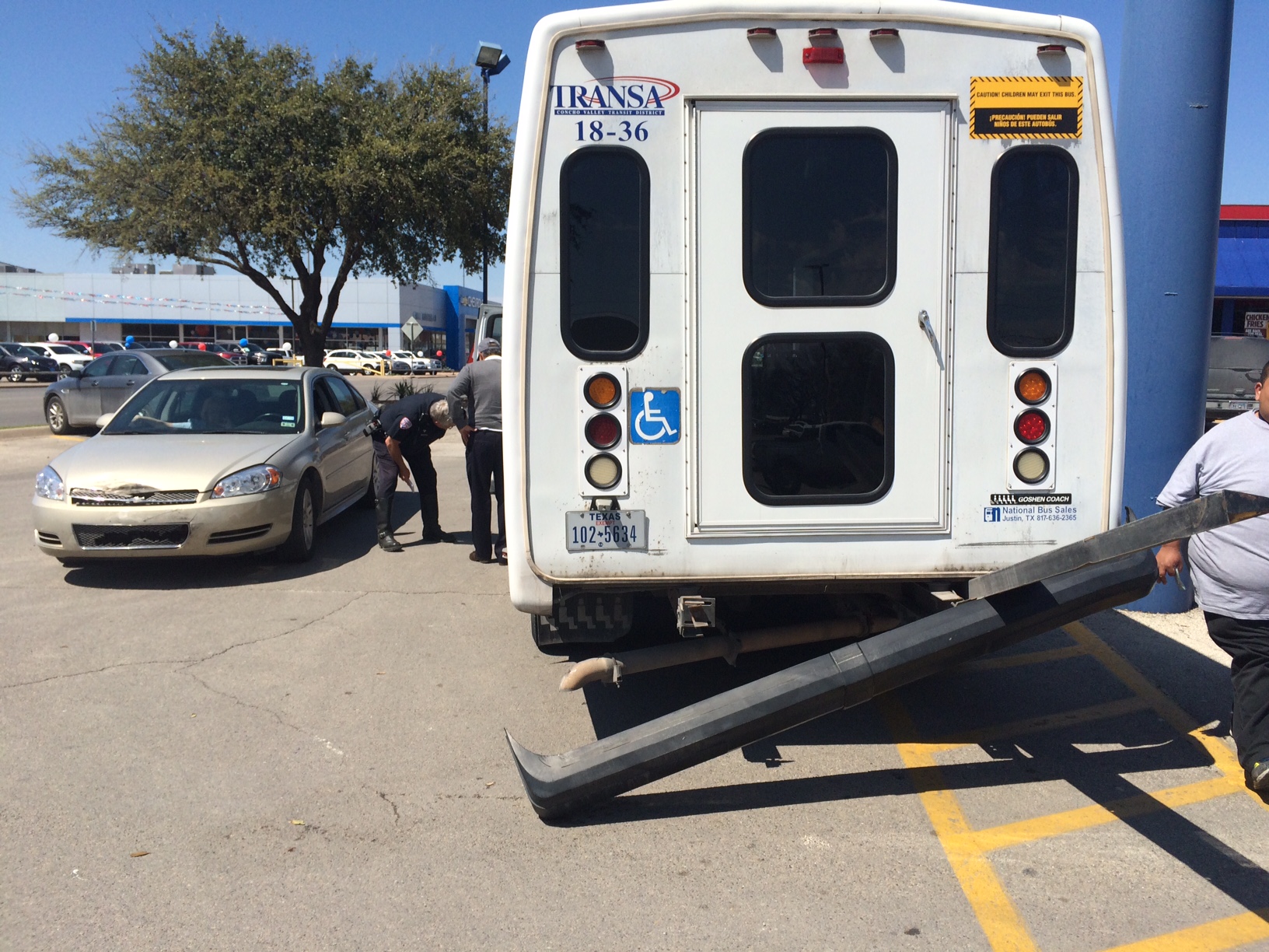 According to the San Angelo Police Department, the Impala was pulling out of Burger King and cut it too close behind the TRANSA bus that was southbound on Abe in the inside lane. “Basically, she caught that left back corner of the bumper and ripped it off,” Officer John Palmer said.