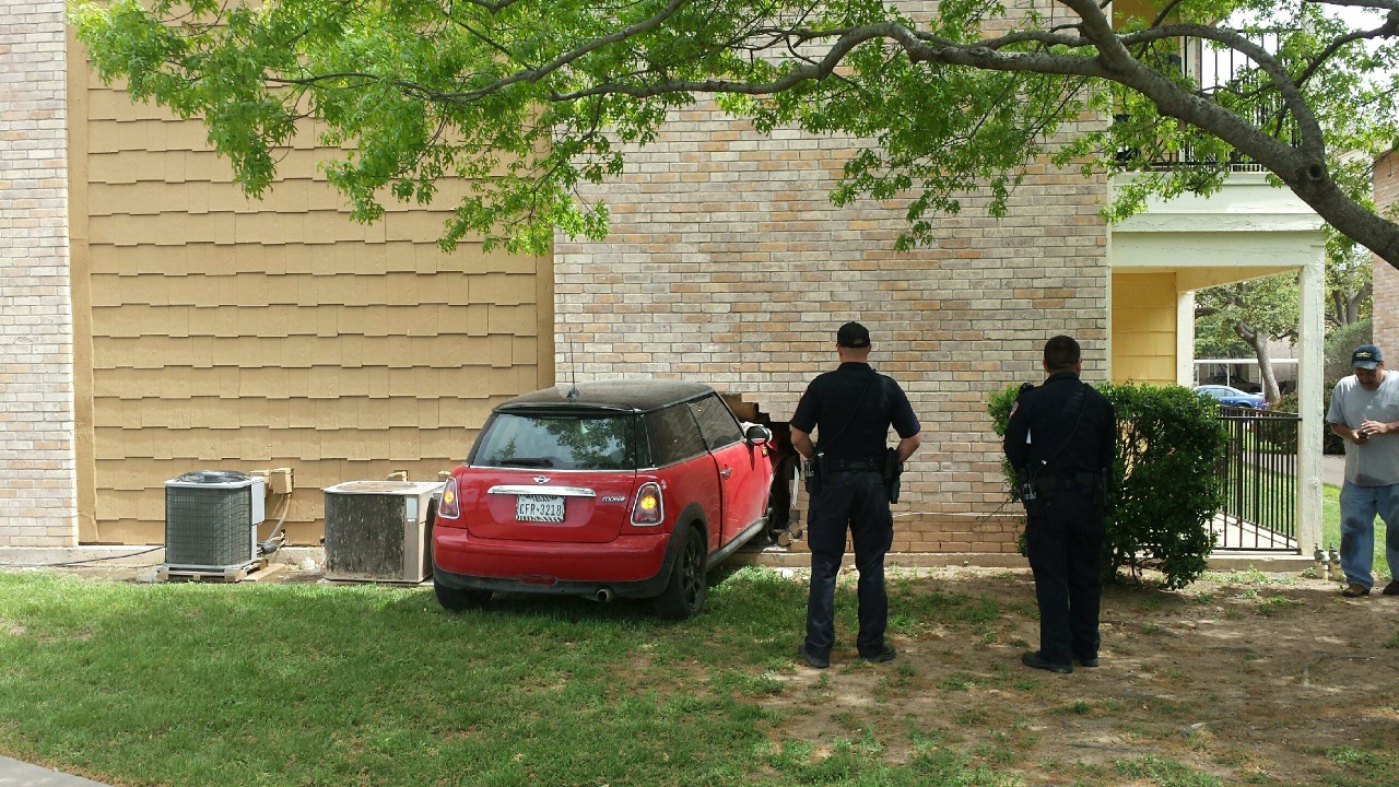 Officer Loudermilk of the SAPD confirmed that the driver of the Mini Coop is still at large. The suspect seen fleeing the scene by witnesses is reported to be about 5'7" in height, wearing a brown shirt, and has facial and neck tattoos.The two suspects at the scene just so happened to be in the wrong place at the wrong time, one was arrested for a warrant. Loudermilk says that the owner of the vehicle has been identified, but was unable to be reached at the time. The vehicle was impounded for futher investigation, and there is no indication that the vehicle was stolen, it was most likely loaned out to what apparently was the wrong person to entrust a vehicle. The estimated damage to the building is $20,000. No one was inside the apartment at the time, and no injuries were reported. .