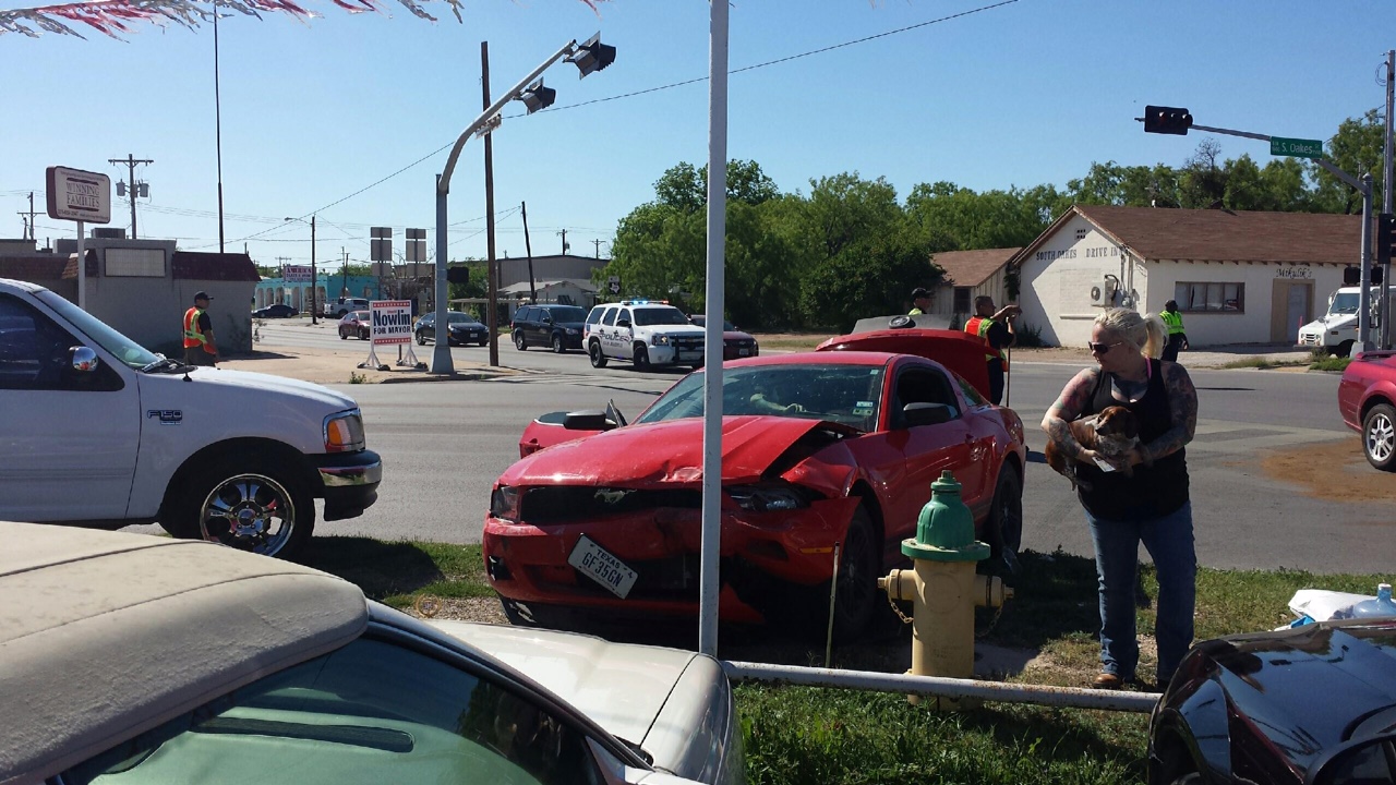According to San Angelo police, a red Mustang was headed west on Ave. L attempting to turn left (south) onto S. Oakes. Meanwhile, a maroon Mustang was headed east on Ave. L. The red Mustang may have had a green light, but did not yield like the law says you should do. The red Mustang turned in front of the maroon Mustang, and the maroon Mustang hit the red Mustang.