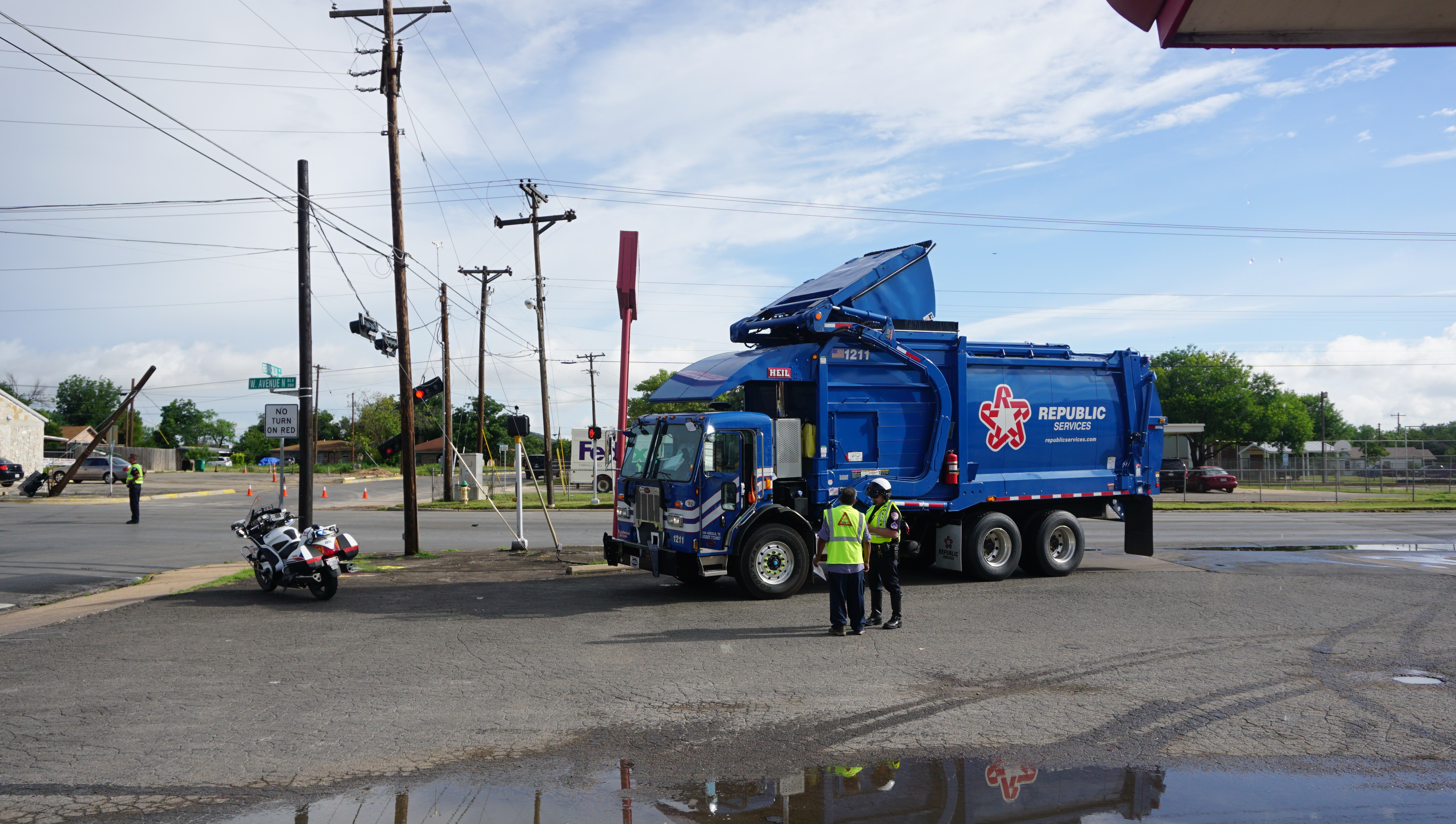 Witnesses said that the Republic Services trash truck was eastbound on Ave. N and snagged the traffic signal line unknowingly. It pulled the signal line down, along with a telephone pole holding the string of traffic lights over the street. The trash truck's driver was unaware this had happened and continued straight ahead. A motorist following the truck who witnessed the incident flagged the truck driver down.