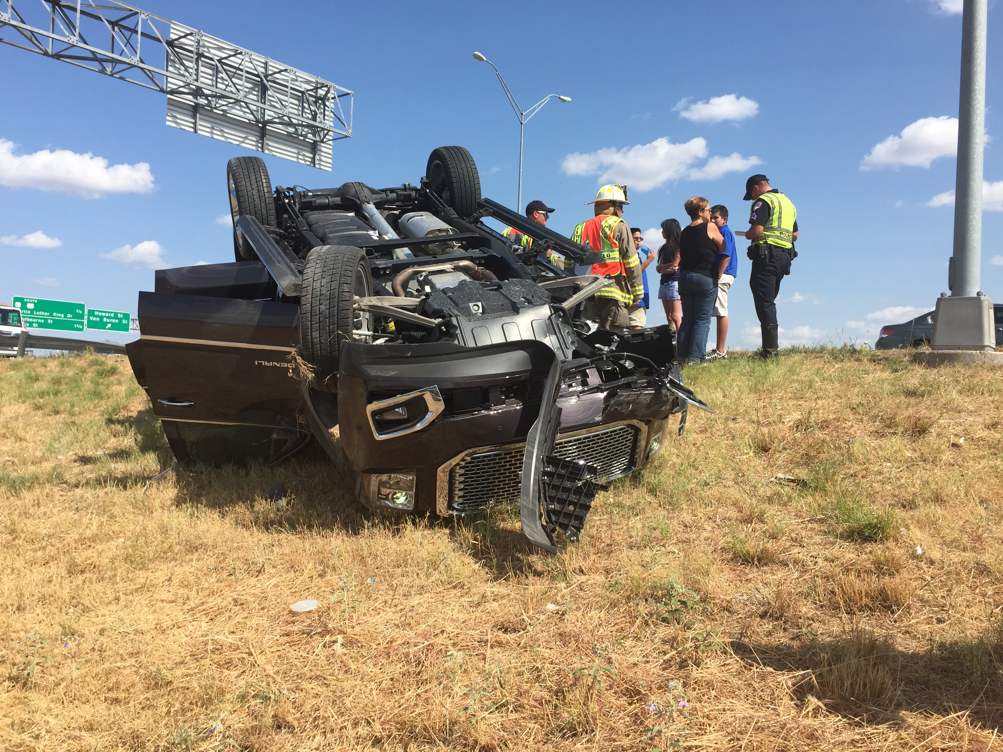 The Denali rolled over as a result of the impact, coming to a rest in the grass next to the roadway.
