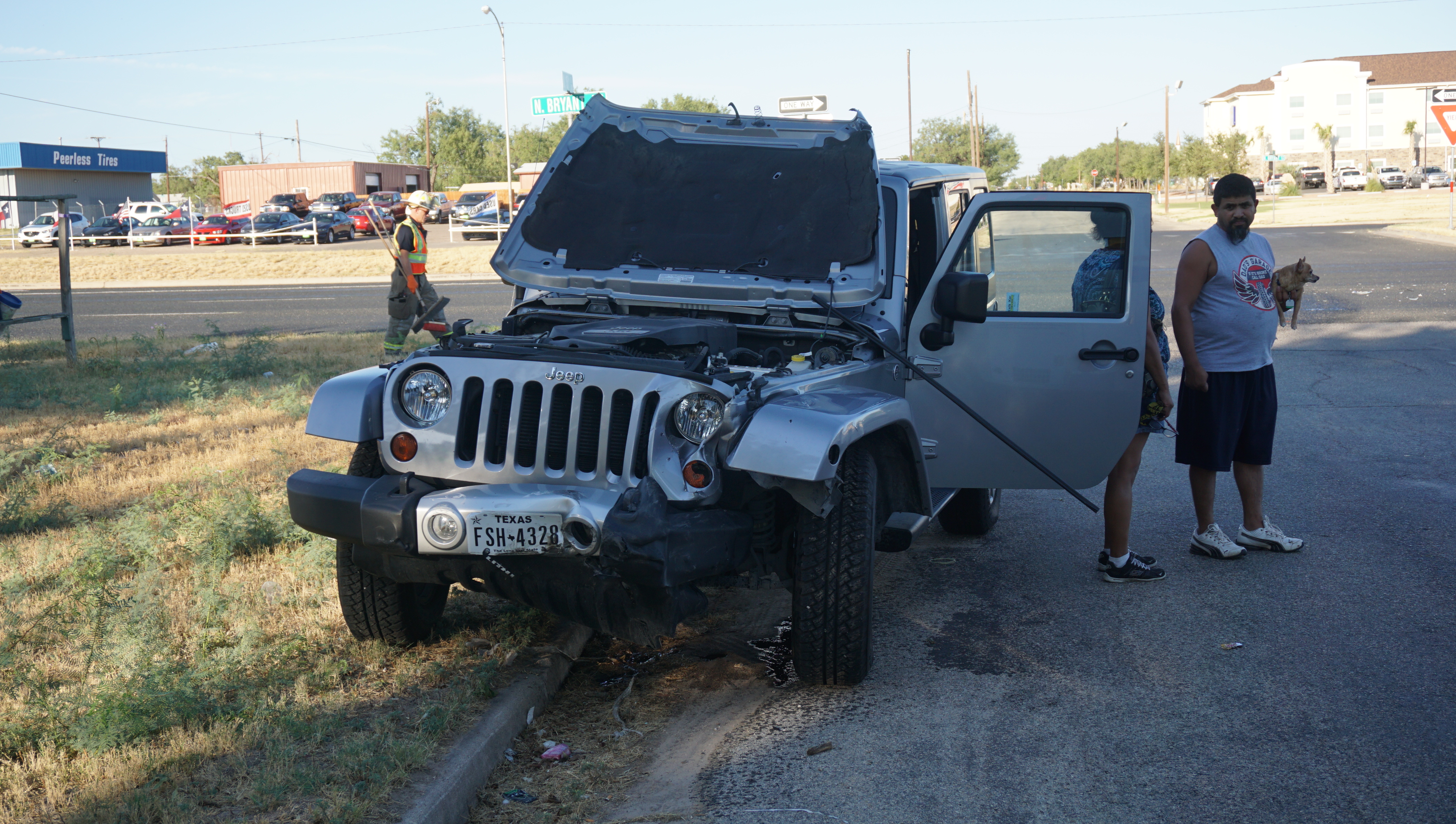 At approximately 6:30 p.m., a white Toyota Camry was westbound on 15th St. and ran into the Bryant intersection, failing to yield the right-of-way. A southbound Jeep on Bryant collided with the Camry.