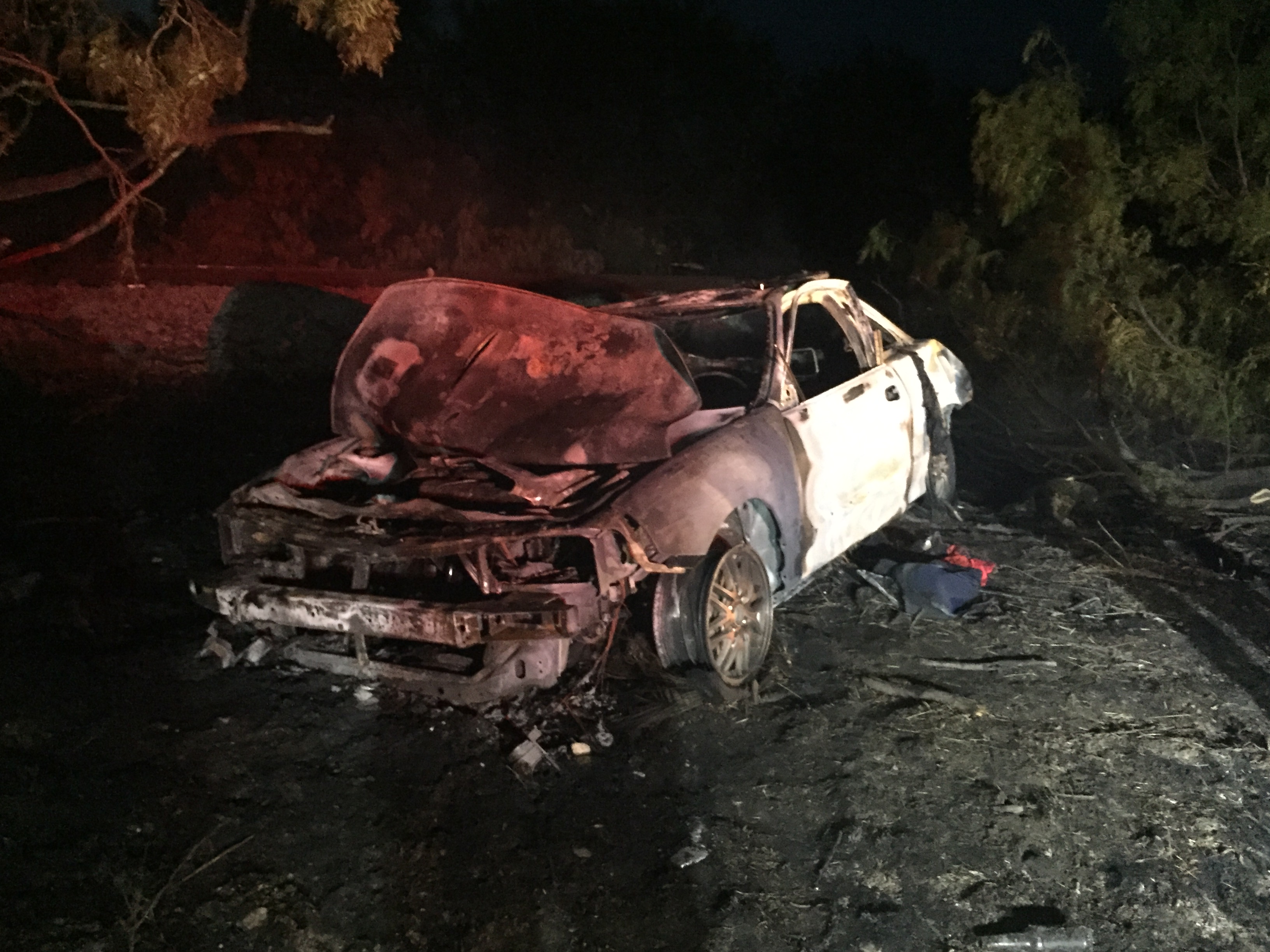 Above: This car burst into flames after the driver lost control and veered of the road outside of Ballinger, Texas. (LIVE! Photo\Megan Holmquest)