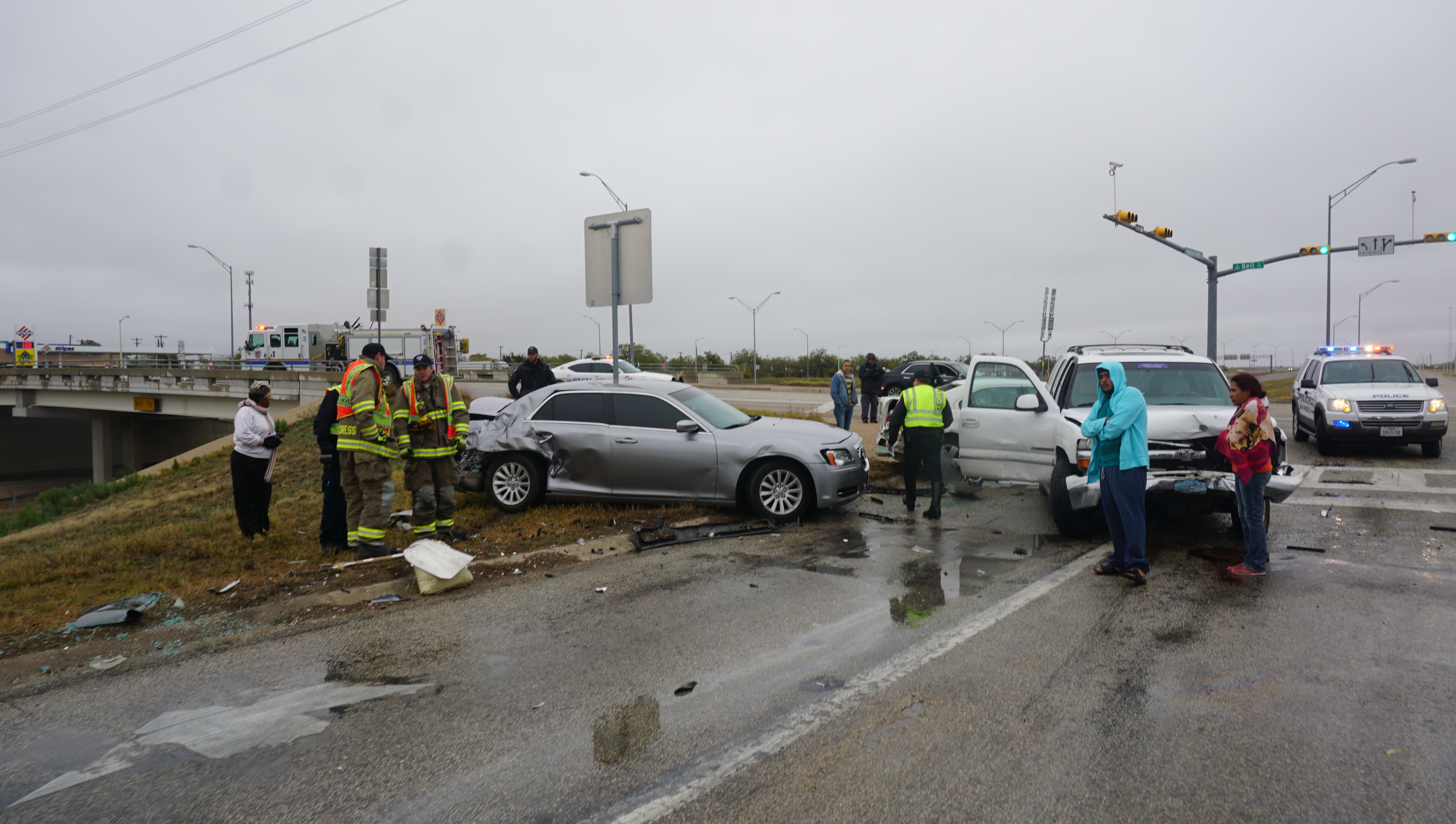 Officer Gesch said the driver of a white Ford Fusion was stopped at the light on Bell St. and the Houston Harte Frontage Rd. waiting to make a left turn at the light. There was also a gray Chrysler stopped behind it waiting to make a turn when the driver of a white Chevrolet Tahoe crashed into the Chrysler causing it to hit the Fusion.