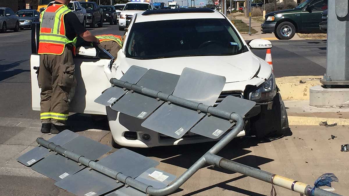 A highway sign was demolished after a lady driving a blue SUV ran a little white car off S. Abe St. while she attempted to turn onto W. Beauregard Ave., San Angelo police said.