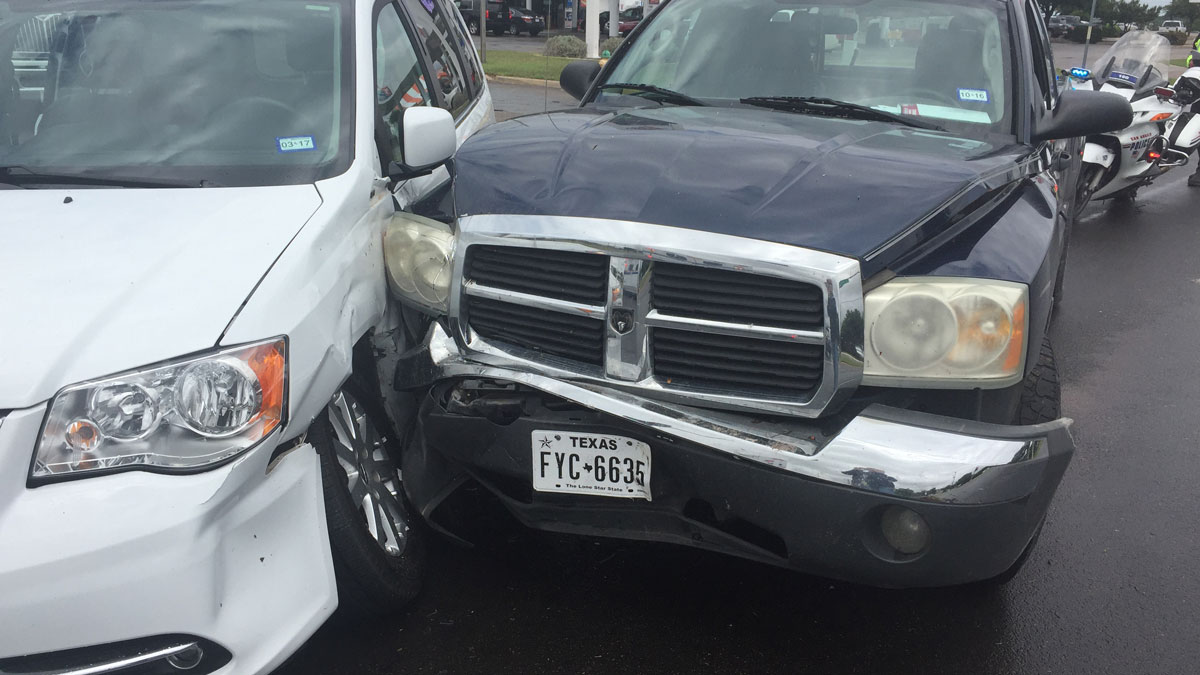 Meanwhile, barreling southbound on Knickerbocker was the driver of a blue Dodge Dakota. She disregarded the red light and crashed into the minivan.