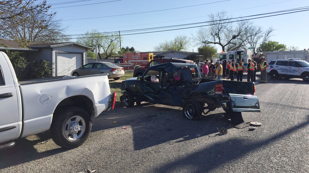 The occupants of the white car were eventually rushed to Shannon Medical Center with injuries. Police did not now the extent of the injuries. The Honda Element and Ram 2500 were unoccupied.
