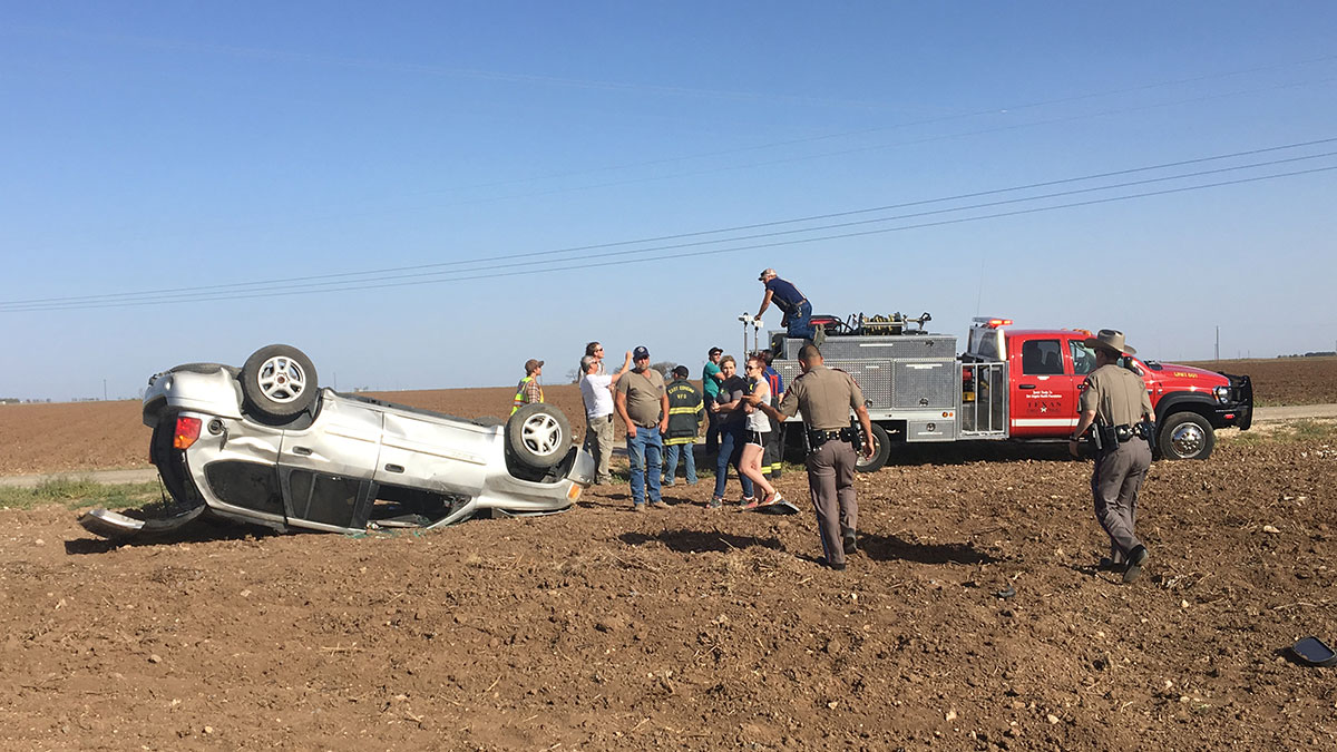 According to Trooper Robert Aldrete, the driver was eastbound on FM 388 at 5:15 p.m. As she approached the double curves near Hohmann Rd., the driver said she reached for her cell phone. Distracted, she didn’t see the 45-degree turn and ran off the road and flipped over.