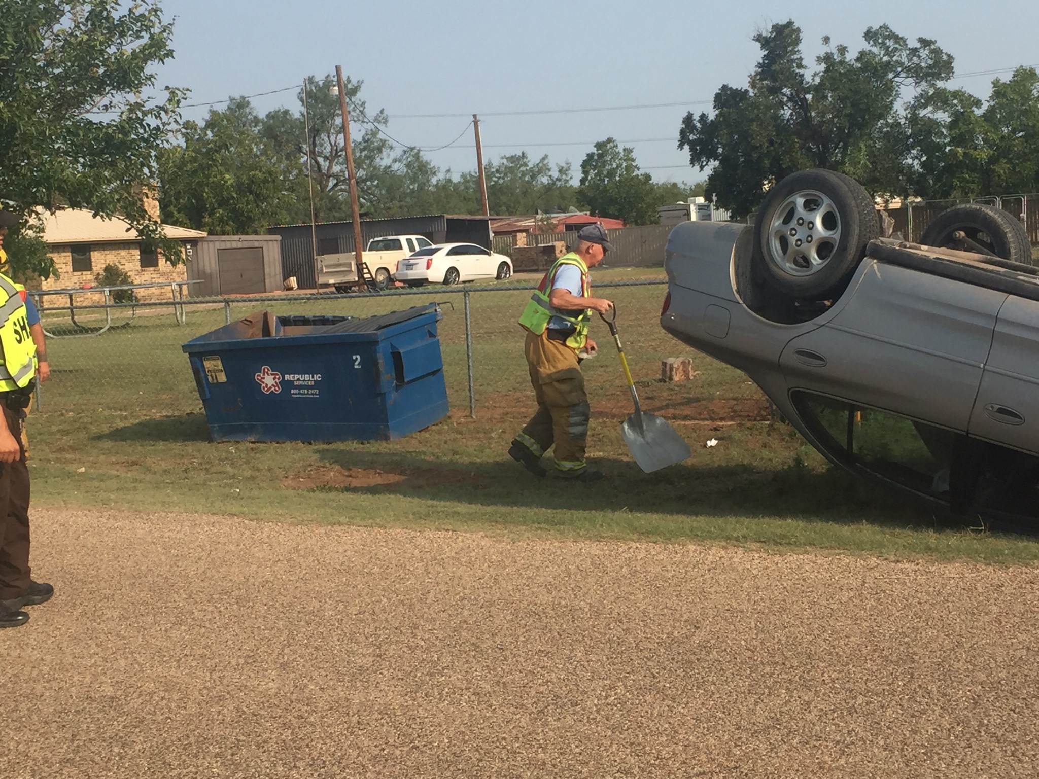 The silver Oldsmobile Intrigue struck a blue trash dumpster on Ute Pass north of San Angelo. The vehicle then rolled on to it's roof. No other vehicles were involved and no one else was hurt.
