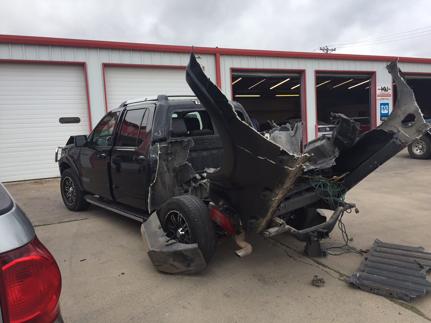 The Ford Explorer Sports Trac was mangled beyond recognition, but police say no one was injured.